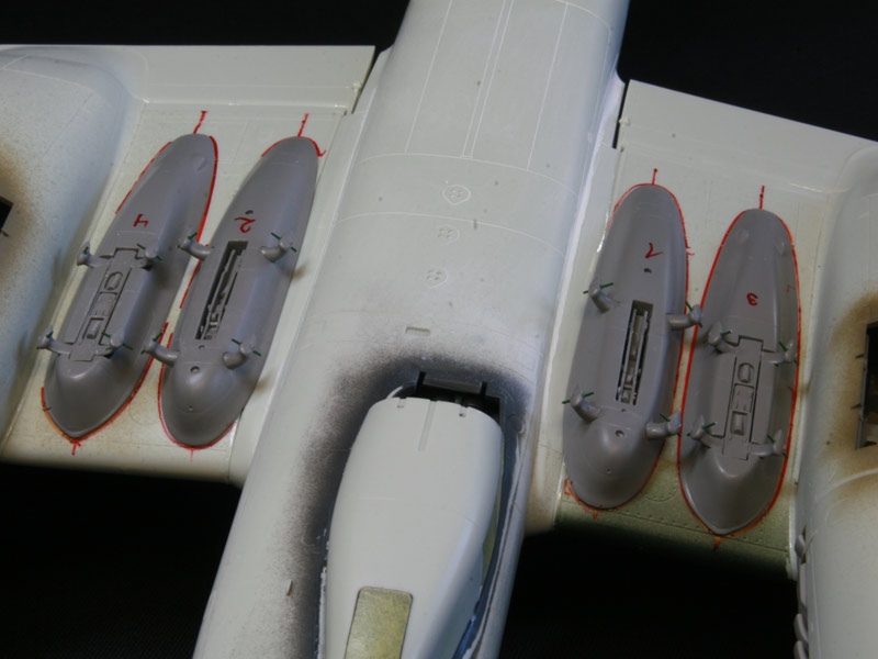 Da die Bombenhalterungen flächig aufgeklebt werden, hatte ich den Tipp, Löcher in diesem Bereich zu bohren.