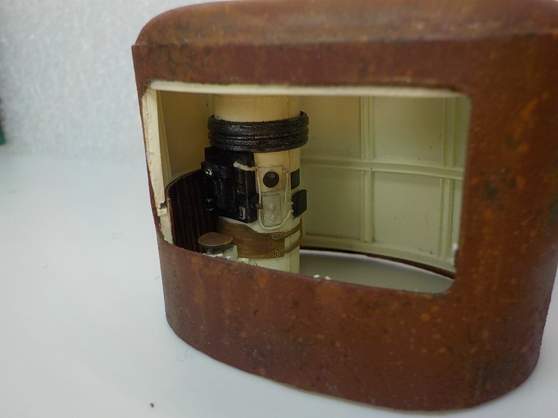 Aufbauend auf den Durchmesser des Schachtes wie in der Zentrale darunter benutze ich folgende Materialien: Kunststoffrohr 11 mm, diverse bearbeitete Teile aus Resinresten, Sheets 0,2 mm ( die Schrauben auf den Plättchen habe ich mit einer Stecknadel – Spitze rundgefeilt – von hinten, platziert aus einem harten Radierer eingedrückt)