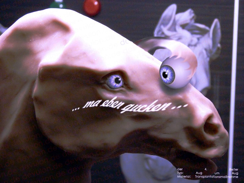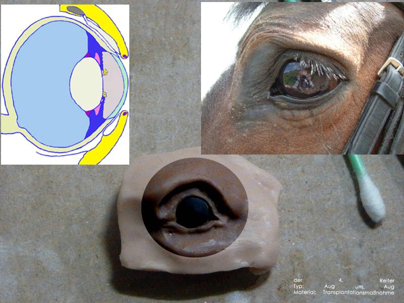 Das große Pferdeauge ist schwierig zu beschreiben. Da musst du dir mal bei Google über die Suchfunktion Bilder ansehen. Als Fluchttier muss es nach vorn und nach hinten gucken können, also stehen sie mehr seitlich, mit Vorrang nach vorne. Der Augenwulst ist auf jeden Fall sehr ausgeprägt und steht oben über, da es der einzige echte Schutz des Auges ist.