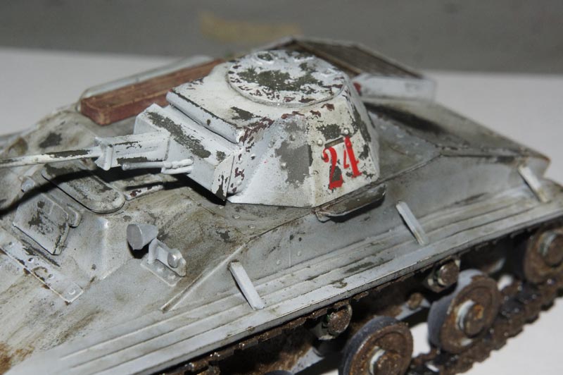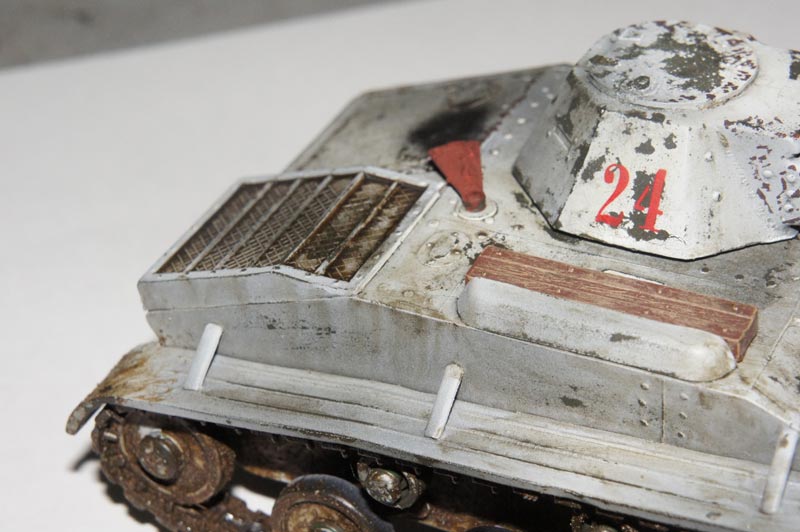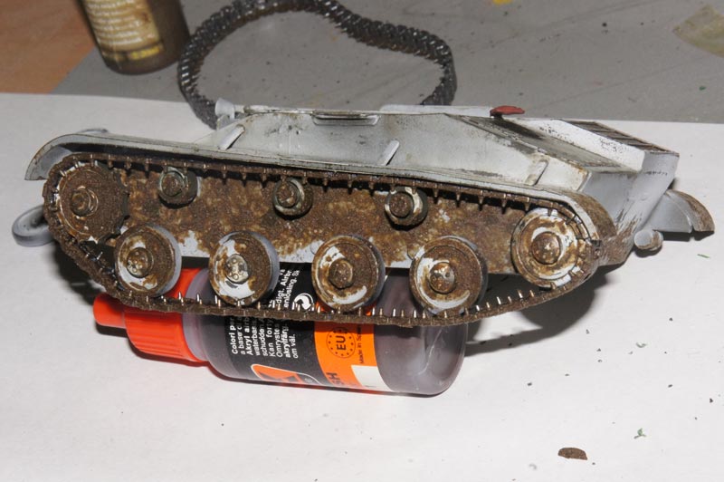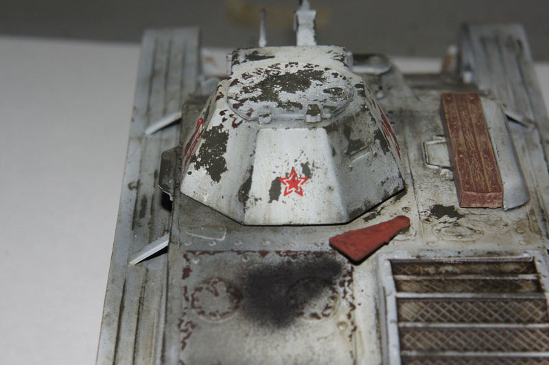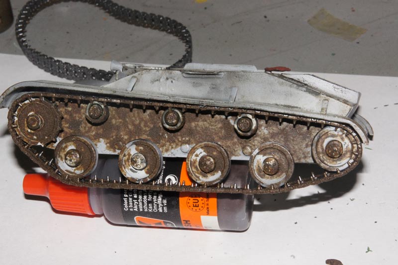 sieht doch schon mal nicht schlecht aus. Was mir nicht so ganz gefällt ist die Sache mit dem Schlamm. Vieleicht kannst du nächstes mal bevor du den Schlamm aufbringst die Partien am Fahrzeug mit der Airbrush in verschiedenen Brauntönen behandeln. Das ergibt dan nach oben hin einen weicheren Übergang. Oder du versuchst nach oben hin weniger von dem Mud-Zeugs am Pinsel zu haben (ähnlich wie beim trockenmalen). Und zu guter letzt hätte ich der Oberwanne ein paar mehr Kratzer reingehauen. Passt irgendwie nicht ganz zum Turm.