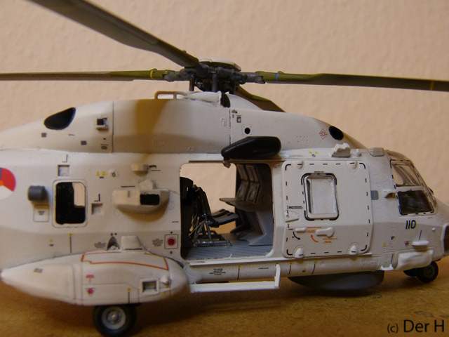 Die Türen habe ich in geöffneter Position angebracht, da mit die Inneneinrichtung sichtbar bleibt. Und nach dem Montiren von Heck- und Hauptrotor war das Modell dann fertig! Der Maßstab war schon eine Umstellung für mich, aber der Bau hat mir sehr viel Freude gamacht. Wie schon in der Bausatzvorstellung vermutet, bekommt man hier für wenige Euros sehr viel Bastelspaß - und Decal-Klebe-Spaß!