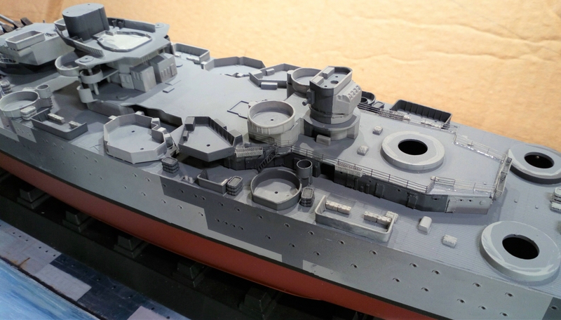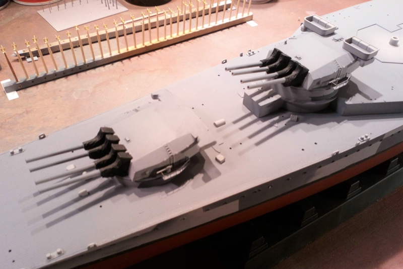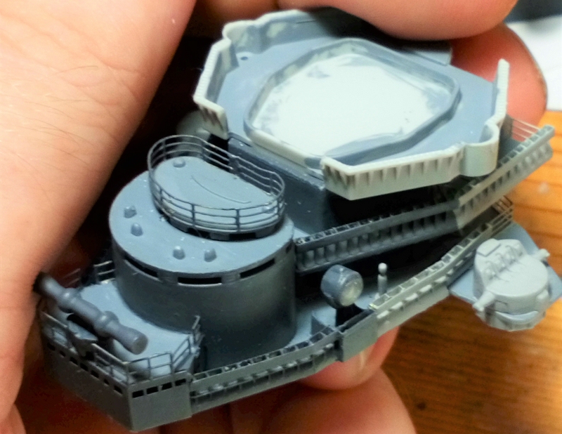 Schornstein und achterer Artillerieleitstand soweit fertig, kommt noch ein E-Messer oben drauf und darauf ein wüstes Radargeweih. Aber das später, diese Baugruppe erstmal beiseite gestellt und mit dem angefangen, was ich seit Wochen vor mir herschiebe: