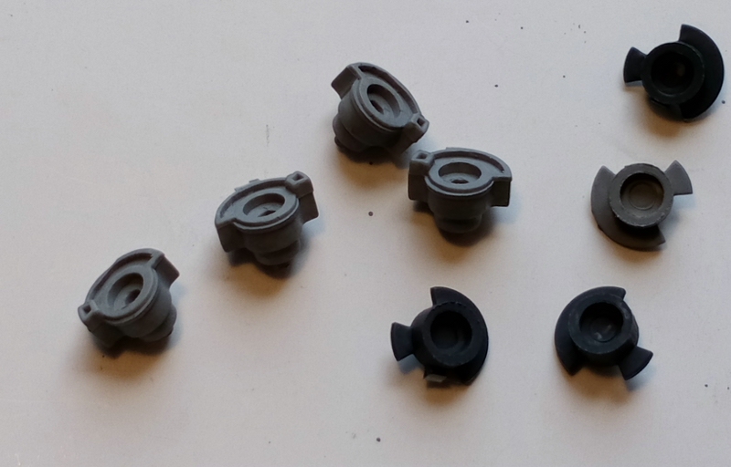Schornsteingitter, Bausatzteil und Flyhawkteil. Ich habe alle Ätzteile mit grauem Haftgrund aus der Dose (Autozubehör) behandelt, denn die Tamiya-Farben, mit denen ich ja das komplette Modell mache, sind ohne Grundierung kaum zum decken zu bekommen. Erschwerend kommt dazu, dass man sie bei diesen sommerlichen Temperaturen sehr schnell verarbeiten muss.