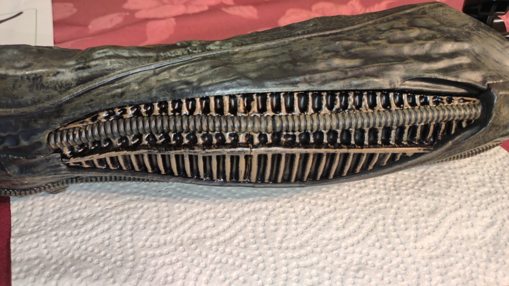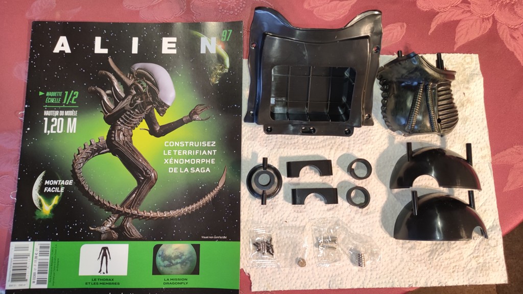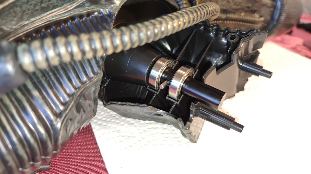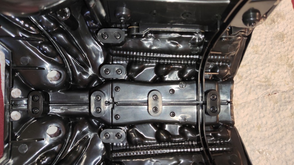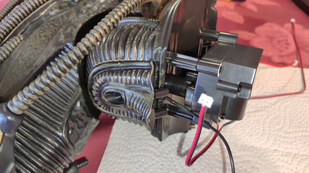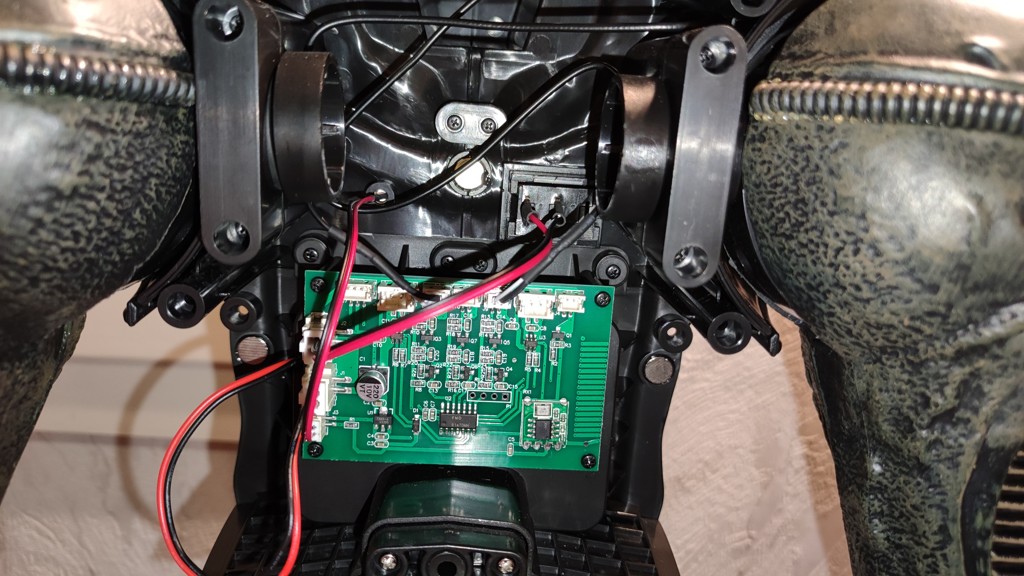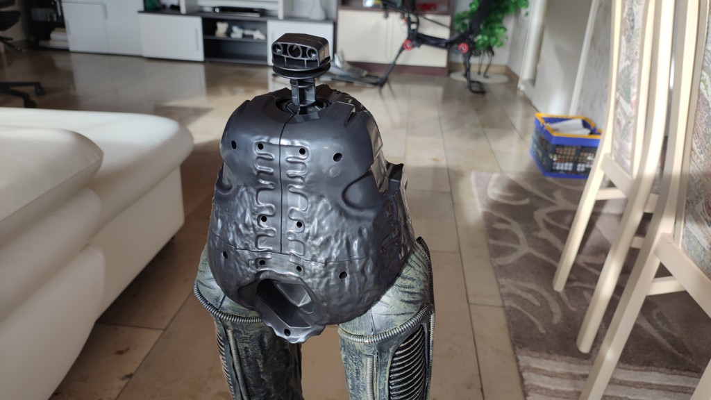 Nun kommt eine etwas knifflige Aktion. Den Kopf setzt man an den Schultern an und muss ihn halten. Dann müssen die 5 Kabel vom Kopf an der Platine eingesteckt werden. Und anschließend die Brustrippen aufgesetzt werden und von hinten mit 4 Schrauben fixieren. Erst jetzt ist der Kopf richtig fest das man ihn loslassen kann.