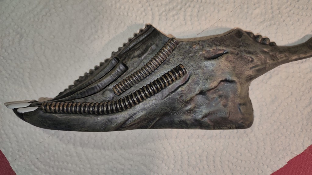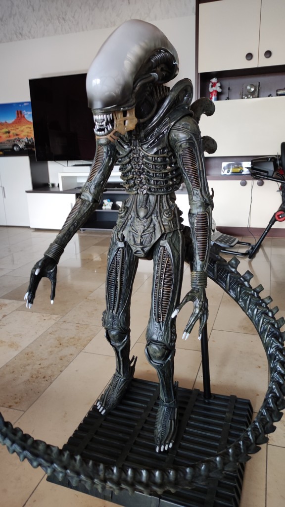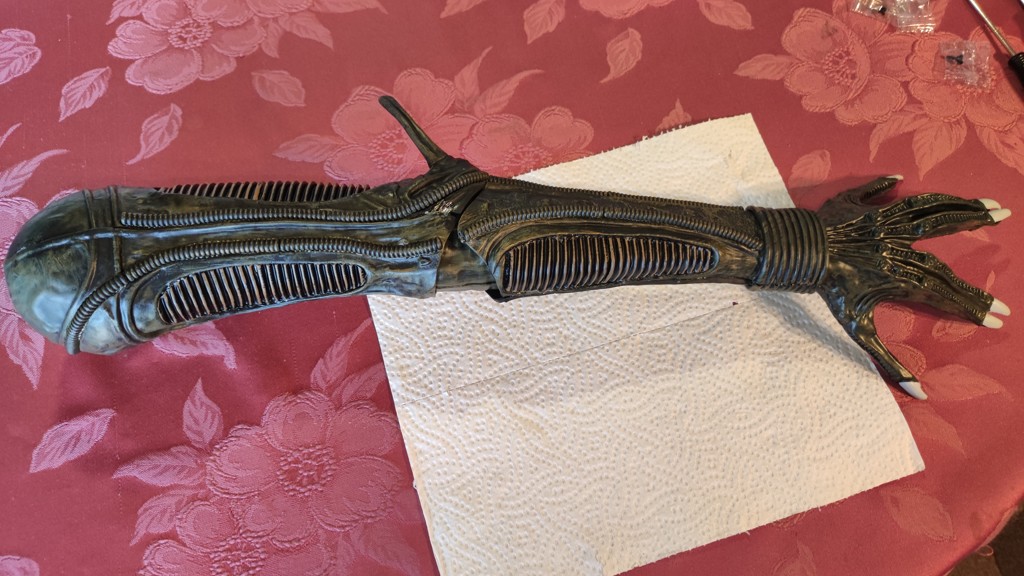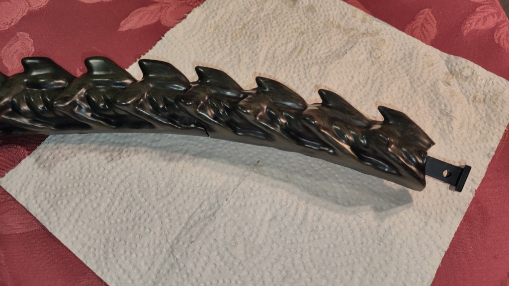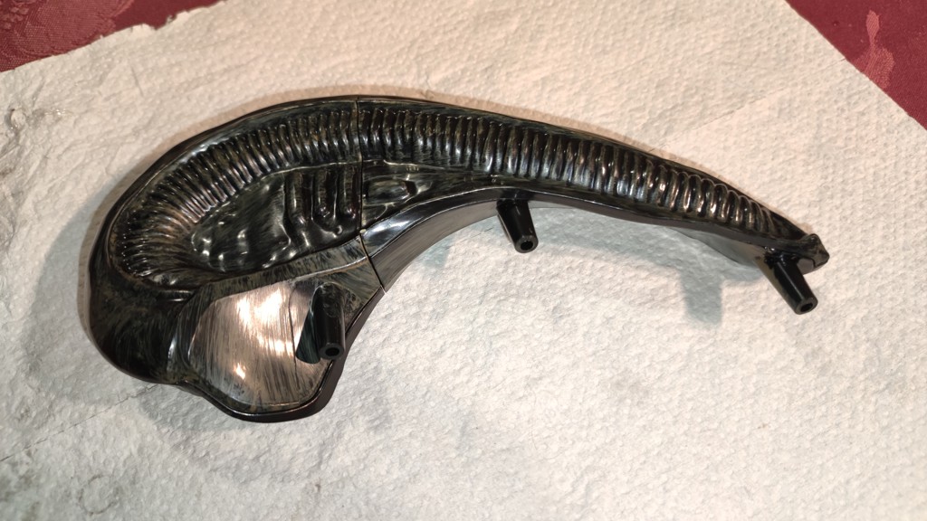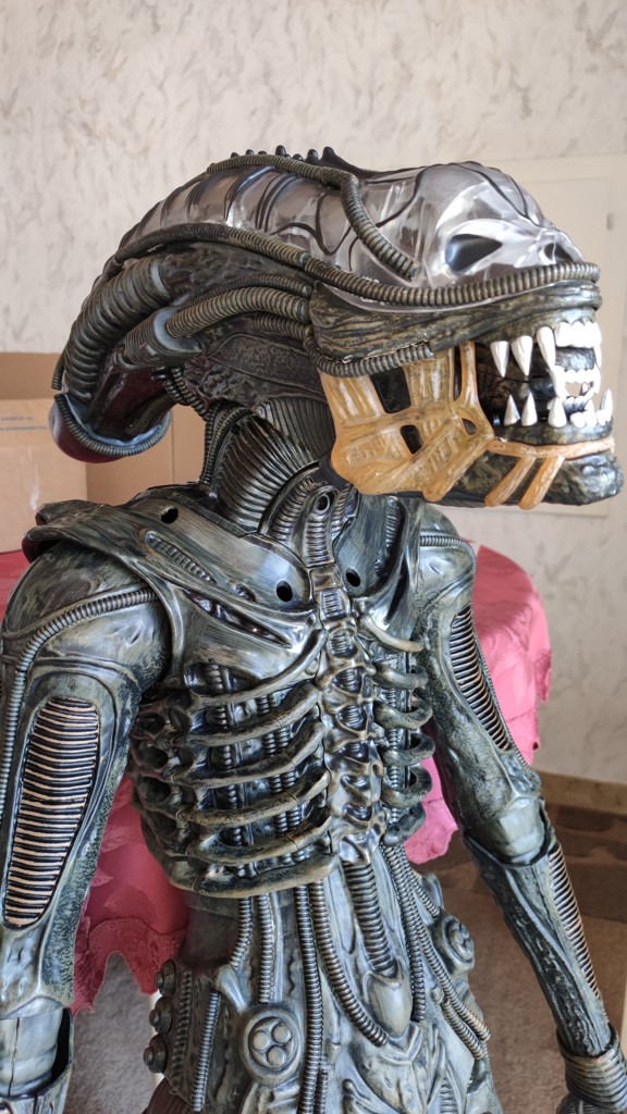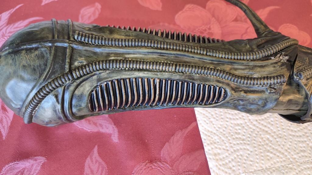 Nun kommt eine etwas knifflige Aktion. Den Kopf setzt man an den Schultern an und muss ihn halten. Dann müssen die 5 Kabel vom Kopf an der Platine eingesteckt werden. Und anschließend die Brustrippen aufgesetzt werden und von hinten mit 4 Schrauben fixieren. Erst jetzt ist der Kopf richtig fest das man ihn loslassen kann.