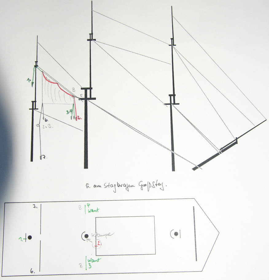 3/4 - Hals: wird doppelt über je einen Block an den Großwanten, dort entlang nach unten geführt, belegt an einer Klampe an der Want.