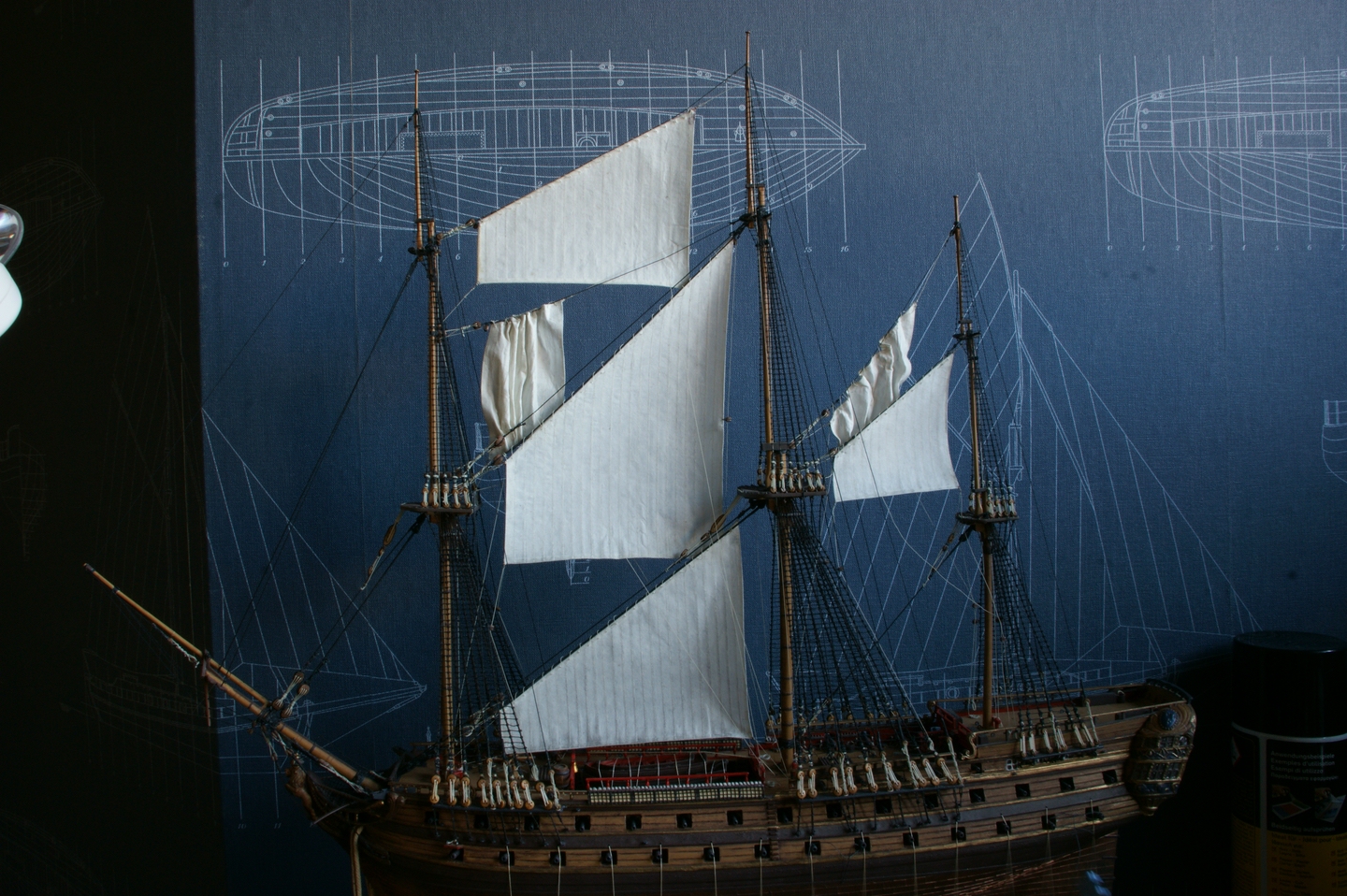 Ich weiß leider nicht, ob ein dreieckiges Segel am Stag bei den Franzosen überhaupt gefahren wurde, könnt Ihr mir weiterhelfen?