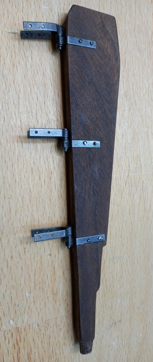 Die Scharnierbänder auf der Außenseite kann man neben Metall auch gut mit Karton oder Kunststoff imitieren, Nagelungen entweder anbohren und mit einem kurz abgeniffen Drahtstück imitieren, oder mit einem Leimpunkt faken. Scharnierbänder oben mit einem Überstand von ca, 1 mm abscheiden, damit etwas Abstand zum Rumpf bleibt.