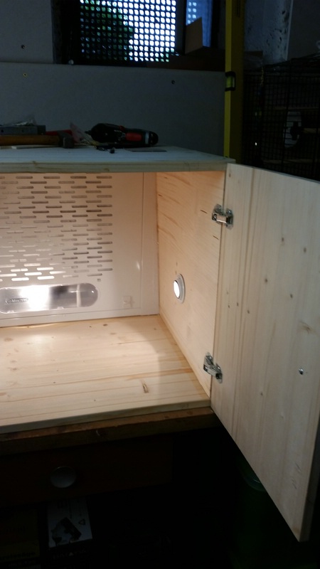 Ich baue eine Kabine, schön. Ich installiere eine Dunstabzugshaube oben, mit Filter, schön...