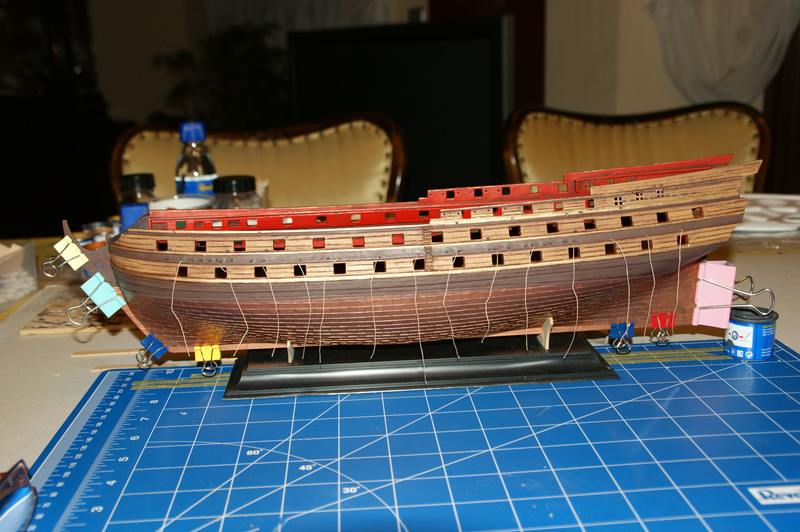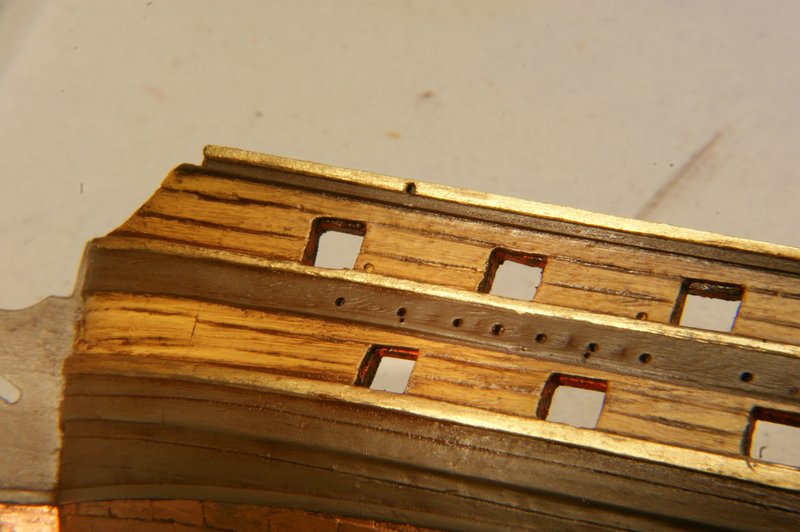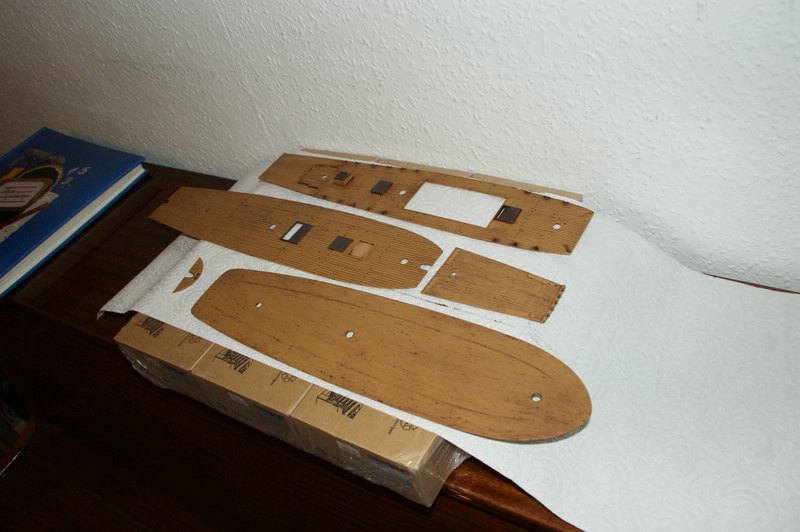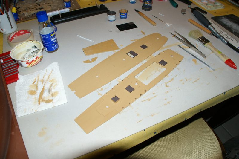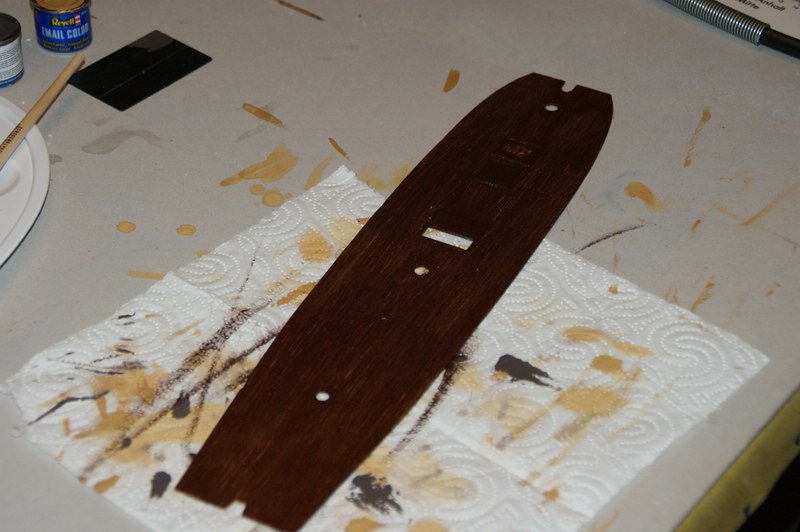 Planken graviert und den Rumpf grundiert mit Humbrol 98 (braun) und Revell 93 (Kupfer)