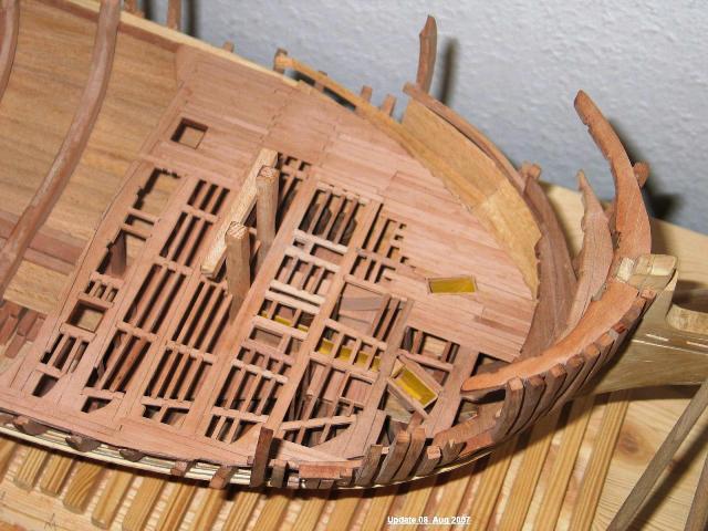Da die Pläne in diesem Buch im Maßstab 1/96 und 1/64 sind brauchte ich sie nur um den Faktor 2 oder 3 zu vergrößern. Ich habe das Modell in Spantenbauweise gebaut und 2 mal mit 1 mm Leisten beplankt. Alle Teile habe ich selber gebaut, außer den Blöcken und den Drehbrassen. Eigentlich hatte ich vorgesehen das es auch fährt. Ich habe es sogar in unserem Schwimmbad getestet aber weil sich dabei die Beplankung etwas gelöst hat habe ich die Elektronik und Mechanik für die Segel wieder ausgebaut. Ich wollte die Beplankung auch nicht mit Polyester verstärken da das Schiff so original wie möglich aussehen sollte.