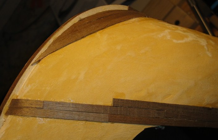 Vor der zweiten Beplankung muss ich ja eh einige Stellen spachteln und dann versuche ich auch die evtl. auftretenden unsauberen Stellen am Bug zu modellieren.
