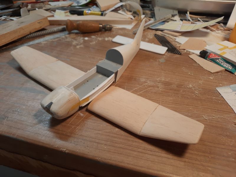 Was beim Rumpf sich aber als Problem herauskristallisiert: Ich befürchte, dass ich einen Fehler gemacht habe mit der Verwendung von dem 0,25 mm Sheet zum beplanken. Durch das ständige Handling, schleifen usw. sind im Laufe der Zeit immer mehr Stellen aufgetaucht, die ich nachbessern musste. Sieht man auf dem ersten Bild am linken Bildrand am besten. Aber ich bleibe mal vorsichtig optimistisch...