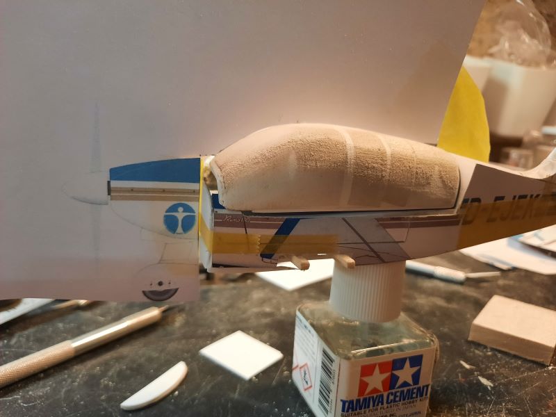 Aktuell habe ich wieder etwas am Rumpf gearbeitet und am Heck die Abdeckung für den Rumpf-Seitenleitwerk-Übergang angefertigt. Eigentlich ist das ein Teil, da es aber in sich mehrfach gekrümmt ist, versuche ich mein Glück auf mehreren Etappen mit Kleben und Spachteln. Zuerst seitlich ankleben und wenn das getrocknet ist, vorne um die Nasenleiste herumziehen und dann die Lücken verspachteln. Mal schauen, ob mein Plan aufgeht...