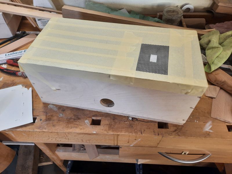 Und auch die Tiefziehbox ist fertig. Ich habe aus Holz eine Kiste zusammengeleimt, oben drauf ein Lochblech geschraubt und in die Seite ein Loch für den Staubsauer gebohrt. Dem ersten Tiefziehversuch steht nun nichts mehr im Weg...