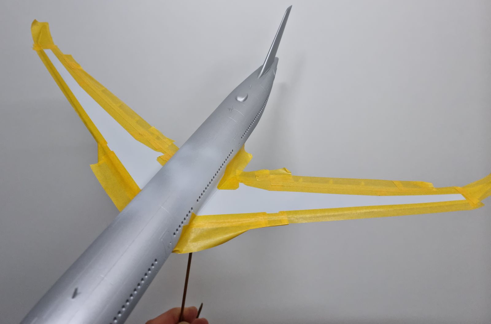 Die Winglets aus Polystyrol gesägt, in Form gebracht und mit mit Stiften am Tragflächenende verklebt, wie bei den beiden 767 war nichts neues, nur die eigenwillige Form war nicht ganz so leicht zu treffen.