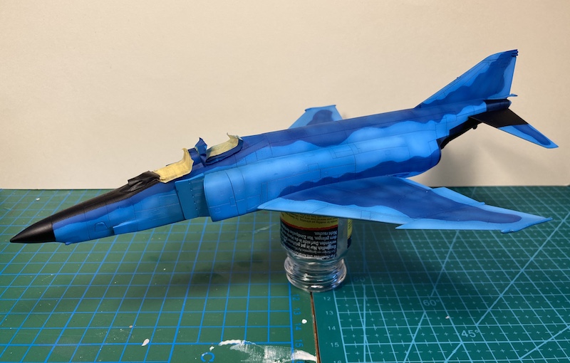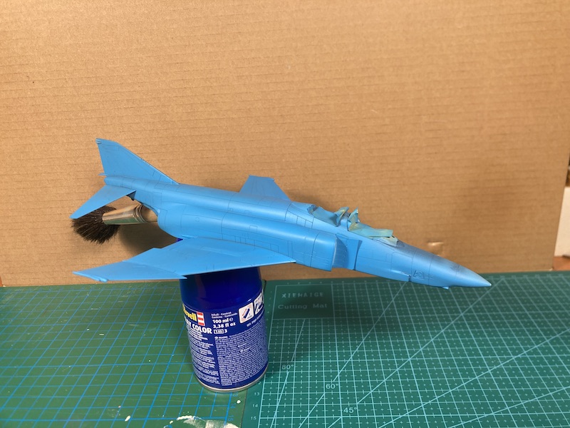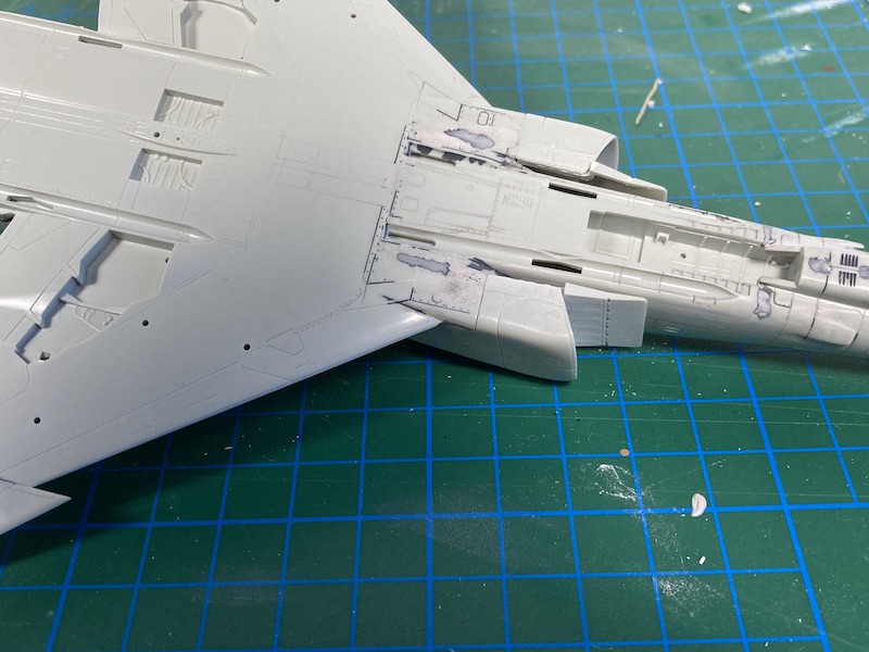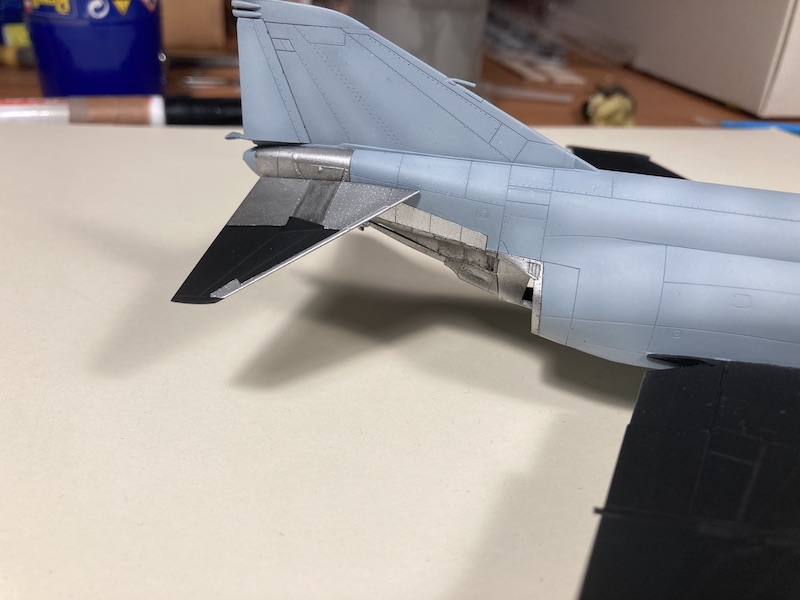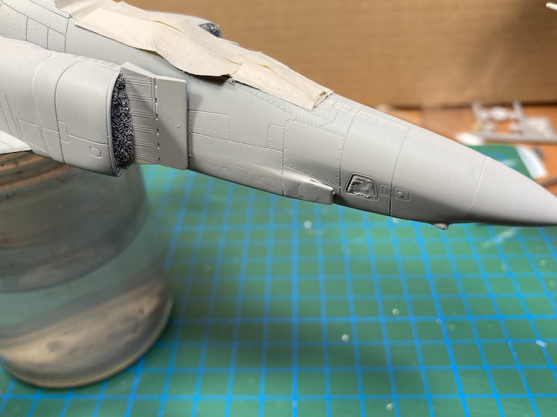 Nach ein, zwei Tagen Trocknung nahm ich mir die Nase der F-4EJ vor. Wie auf Orginalfotos zu erkennen, verlaufen auf der Radomhülle mehrere Sensorenbänder. Ich habe versucht diese aus Ätzteilen in zuvor gesägte Kerben des Bausatzteils einzupassen. Mal schauen wies es am Ende verschliffen und grundiert wirkt.