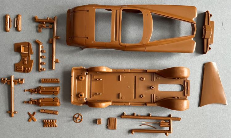 Fazit: Ein sehr seltener und ebenso ungewöhnlicher Bausatz eines nicht existenten Vorbilds. Karosserie und Innenraum sehr detailliert. Etwas einfache Motornachbildung. Durch Vorbereitung für Slotcar-Umbau keine Motorraumdetails, Befestigung des Chassis mit Schrauben und glatte Bodenplatte ohne Fahrwerksdetails.