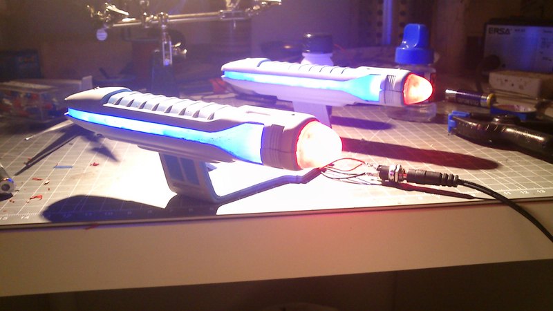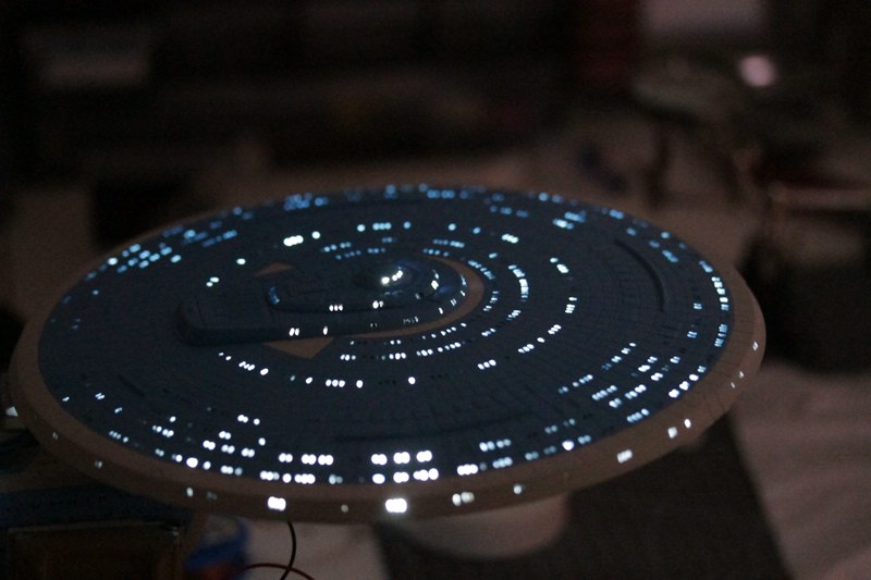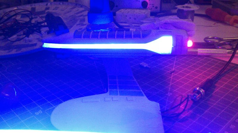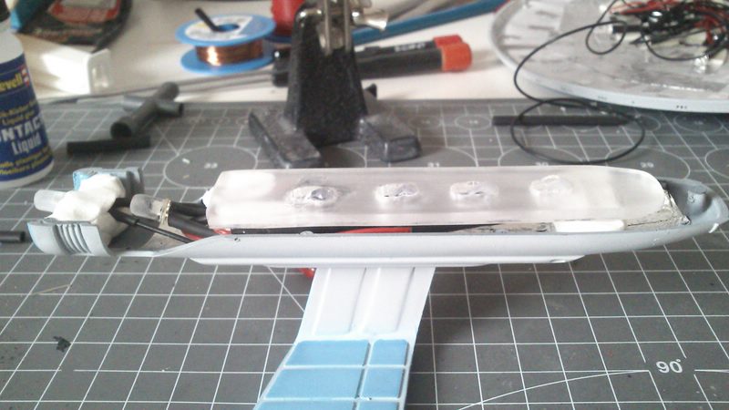 da ich mir heute den Bau Thread von SummX durchgelesen habe, hat es mich heute Abend gepackt und ich habe meiner Enterprise C Licht spendiert. Aber erstmal nur die Untertassensektion. Weiter bin ich noch nicht gekommen. Ich betreibe den ganzen Stromkreis mit 5V und habe jeder LED einen Widerstand (150 Ohm) verpasst. Ich habe schon mal die Grundlackierung abgeschlossen. Und es muss aber noch verspachtelt werden. Kann sein, dass sich die Lackierung noch ändert. Ich werde die Woche noch weiter machen.