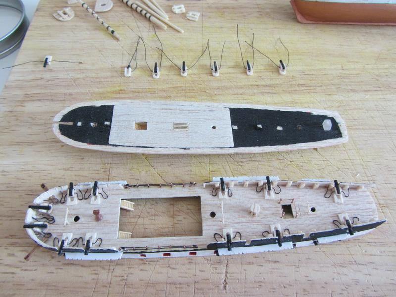 Es stellt sich mir wieder eine Frage: Auf dem oberen Deck wurden 10 Karronaden aufgestellt. Der Bauplan zeigt aber 18 Geschützluken. Das macht zwei für die Kanonen am Bug und zwei, die leer bleiben am Heck (die hinteren seitlichen Geschütze wurden beim verfolgt werden nach hinten umgestellt). Und dann? Ich habe jetzt beide Luken vor der Kuhl mit Geschützen versehen, aber hinter der Kuhl habe ich seitlich fünf Luken und nur drei Geschütze. Soll das so? Habe ich den Plan falsch gelesen und meinem Schiff zu viele Löcher gemacht? Hat jemand eine Idee?
