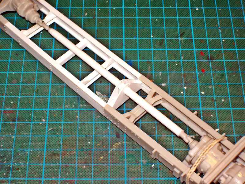 Schön das Euch meine Bastelei bis hier gefällt, gibt Mut zum weiter machen. Mal zum Kardan noch ein Wort/Satz. Rudi mag da durchaus recht haben, das Teil wäre im Original 3,5m lang, aber hier geht es eher um Stabilität als um Originaltreue, sitzt ja genau an einer Schnittstelle des Fahrgestells. Wie mein Namenskollege ja schon so richtig schrieb kommt da ja noch die „Büchse“drauf und man sieht da später nichts mehr weiter. Auch bin ich mir noch nicht sicher ob der Container, im Modell, fest oder abnehmbar wird, da gibt es ja auch im Original beide Möglichkeiten, so das jedes Quäntchen an Stabilität wichtig sein könnte.