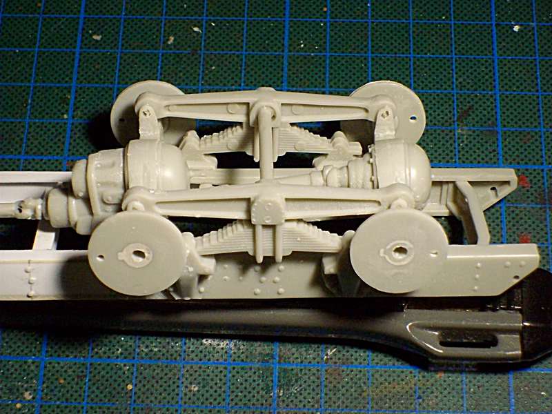Nun wurden die vorderen und hinteren Federpakete an das Fahrgestell angeklebt. Vorher mussten auch an diesen Teilen einiges an Graten entfernt werden. Auch die Vorderachse wurde dann gleich mit angebaut.