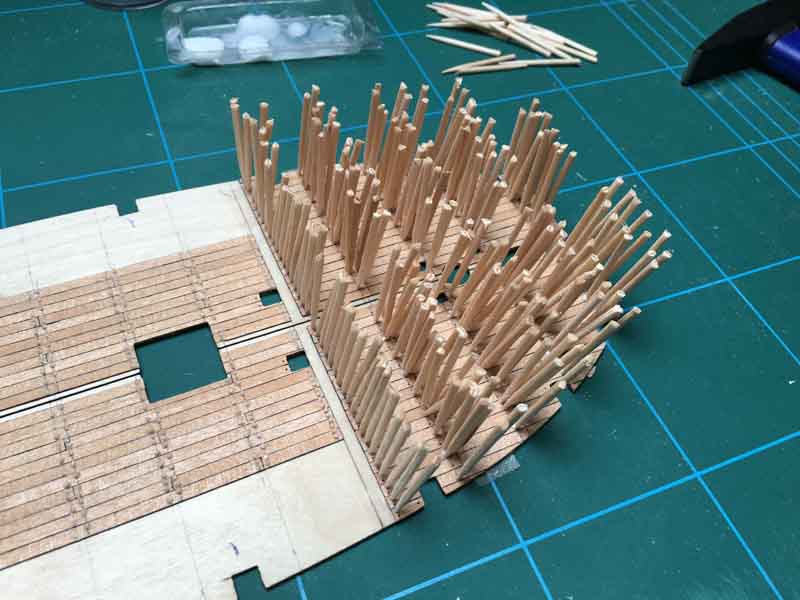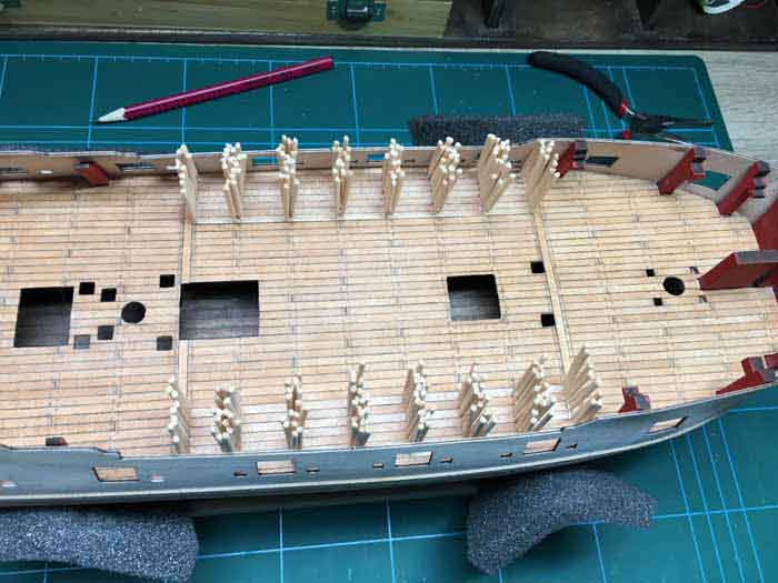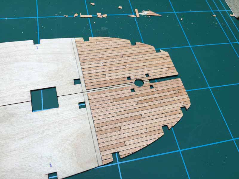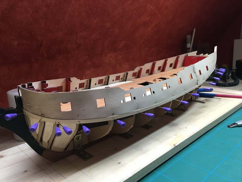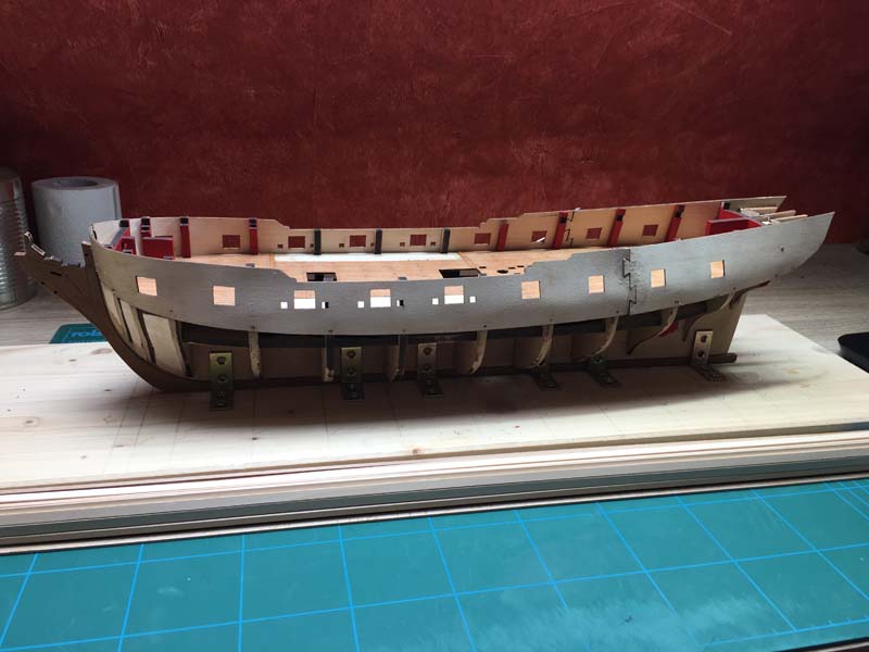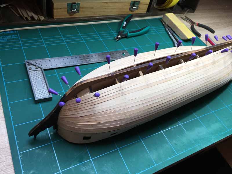 Ich habe mir extra die hellen Leisten für die Beplankung oberhalb der späteren Kupferung zurechtgelegt. Bislang liegen alle Planken recht gut eben und aneinander. Ich hoffe, dass sich die Schleifarbeit damit in Grenzen halten wird.