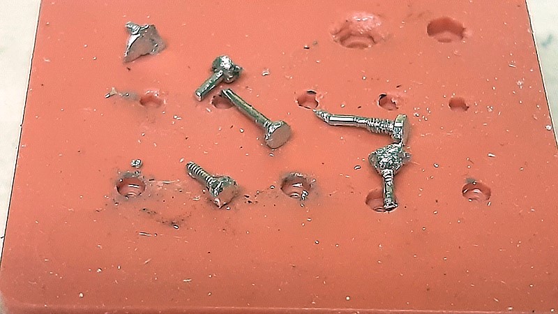 Meine Idee, mit dem Lötkolben Lötzinn in der Form zu schmelzen und in die Schrauben-Massenproduktion zu gehen, scheiterte an der Oberflächenspannung des flüssigen Lötzinns, es haftete in hübschen kleinen Kugeln an der Lötspitze. Entsprechend verhunzt waren meine nagelneuen Zinn-dump-it-screws. Die konnten selbst zum Mindestlohn nicht gerettet werden.