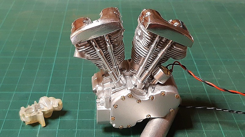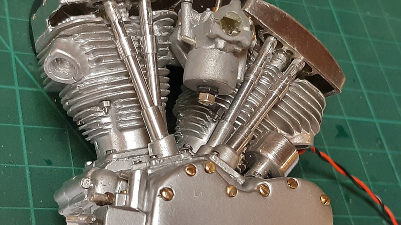 Ihr, die hartgesottenen Harley-Fans, habt es sicher schon bemerkt: Die Zylinderkopfschrauben !! Revell hat sogar passende Aussparungen dafür vorgesehen, jedoch ohne die Schrauben. Sie sitzen am Übergang vom Zylinder zum Zylinderkopf. Nach meinen Recherchen sind das bei der Electra Glide Stehbolzen mit Muttern. So habe ich sie gemacht: Zuerst vorsichtig die Löcher vorgebohrt: