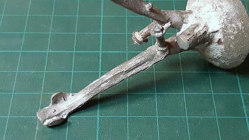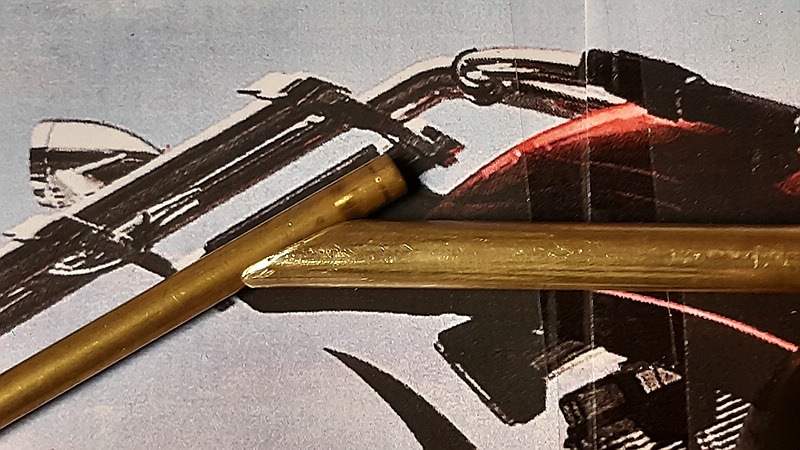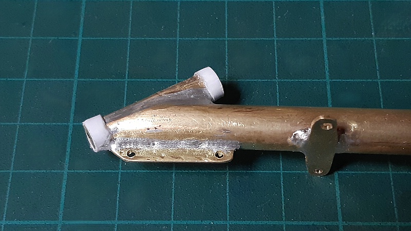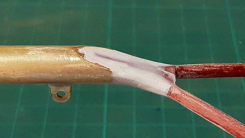 Ich mischte MS-Putty, stopfte es in das Ende des Rückenrohres, sodann konnte der Restrahmen im Messingrohr ausgerichtet werden. Ich legte das Putty vorsichtig an und formte einen Übergang aus, dabei kontrollierte ich nach jedem Strich mit dem Modellierinstrument, ob noch alles sauber in der Spur war. Schließlich sah es gut aus, und ich ließ das Ganze über Nacht durchhärten.