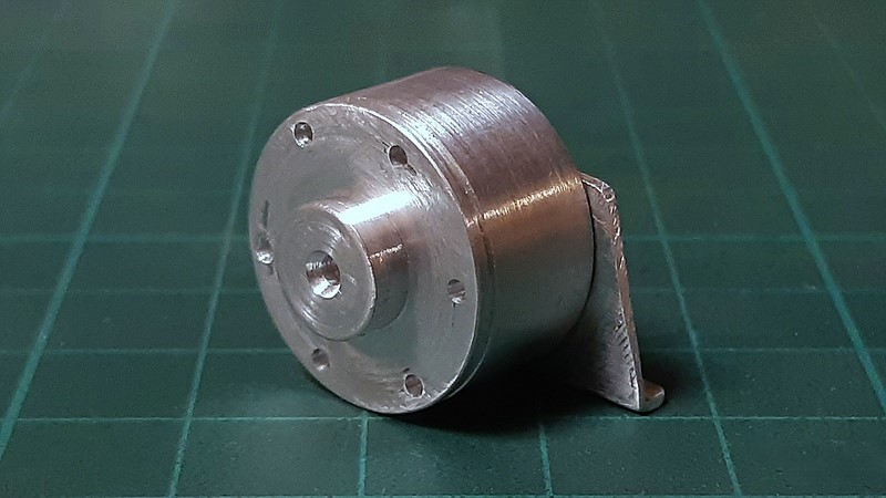 Somit benötigte ich zunächst eine Hydraulikpumpe, die die Kraft des V2-Motors in hydraulische Energie umwandeln konnte. Also drehte ich ein hübsches Teil aus Alu und markierte die Positionen für die Verschraubungen.