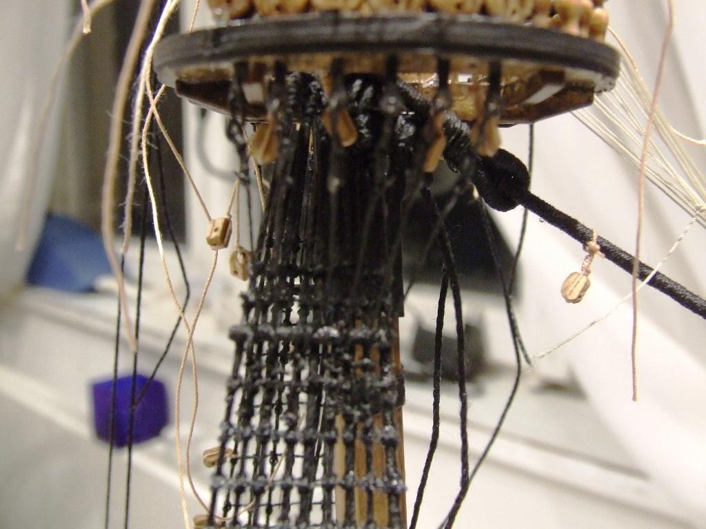 Die Taustärke der einzelnen Wanten sind ident mit den darüber anzubringenden Stengewanten (d.h. für den Fockmast 0,5mm, den Großmast 0,7mm und den Besanmasten 0,3mm Garn) . Für die Befestigung habe ich die einzelnen Jungfern mit Garn umwickelt (auch wieder mit der dazugehörigem Stärke) und dieses Garn dann in weiterer Folge mit einem Metallstreifen (ca. in der Größe der handelsüblichen Püttingsbeschläge-z.b. von Krick) eingebunden.In diesen Streifen wiederum wurde an einem Ende mit dem Handbohrer ein kleines Loch gebohrt. Dann habe ich die so vorbereiteten Jungfern in die zuvor ausgefrästen Öffnungen der Marse gesteckt und mit nem Tropfen Superkleber-Gel gesichert.Diese "Sicherung" hat nat. en Vorteil, dass beim Spannen der Stengewanten dier Zug nicht auf die unteren Wanten geht, sondern direkt an der Mars endet!! Also nichts mit aufgebogenen Unterwanten - weil der Zug nach oben zu stark ist :baeh: ;)