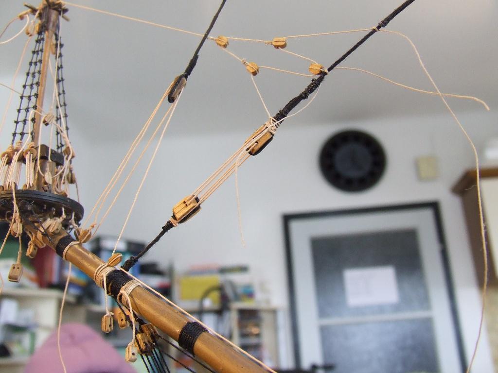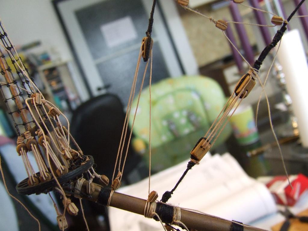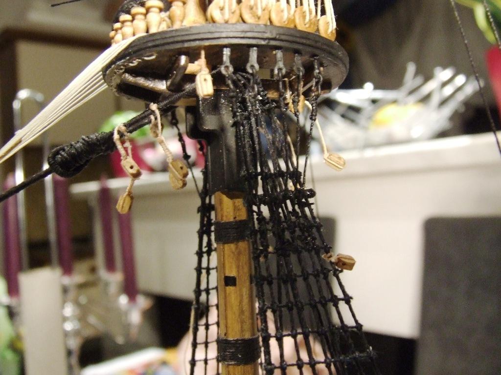 Danach wurden in die einzelnen Wanten an einem Ende kleine Eisenhaken eingebunden, welche dann einfach in diese Löcher eingehakt werden. Ich bin mir nicht sicher,ob diese Form der Püttingwantbefestigung für das Zeitalter der SR gerechtfertigt ist, aber es erschien mir logisch und sieht außerdem gut aus :D .....das untere Ende habe ich mit 2 Zurrings an den jeweils direkt darunter liegenden Want befestigt.