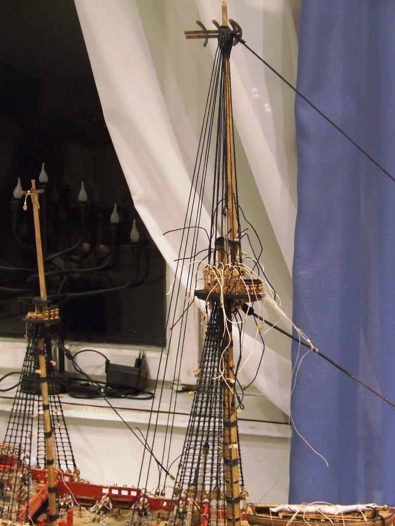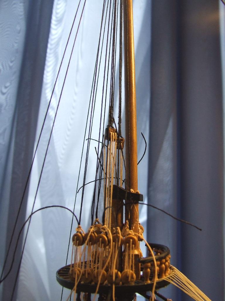 Das war aber noch nicht alles...ich habe soeben die Fock- und Großstengewanten befestigt und möchte euch dies nat. nicht vorenthalten. Ein kurzer Hinweis am Rande für alle die gerade beim Bauen der SR sind, oder sich den Bausatz mal zulegen: ich empfehle euch dringenst sämtliche Stengen mit Stahldraht zu "füllen" um ein etwaiges "Verbiegen" weitgehenst zu verhindern!!! Ich habe (mit Außnahme der Fockstenge- siehe vorangegangenen Eintrag) mit nem 2mm Stahldraht, welchen ich durch zurechtschleifen nen perfekten Umfang für die verschiedenen Stärken der Stenge verpasst habe, den Stengen eine dermaßen hohe Stabilität gegeben, dass auch bei starken Zug (durch die Pardunen) keinerlei Richtungsveränderung zu beobachten war!!