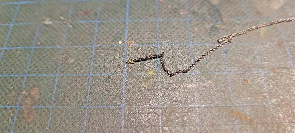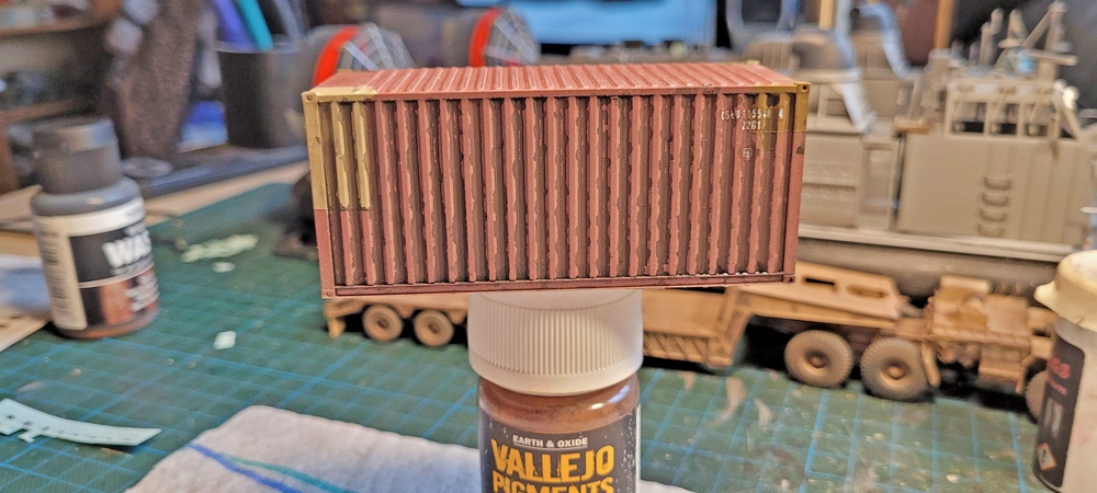 Nach dem das trocken war kam ein Wash aus verölter Erde darüber, danach dann meine Pigmente, von Silber bis Braun darüber zum Schluss noch schwarze und Rostpigmente von Vallejo dazu.