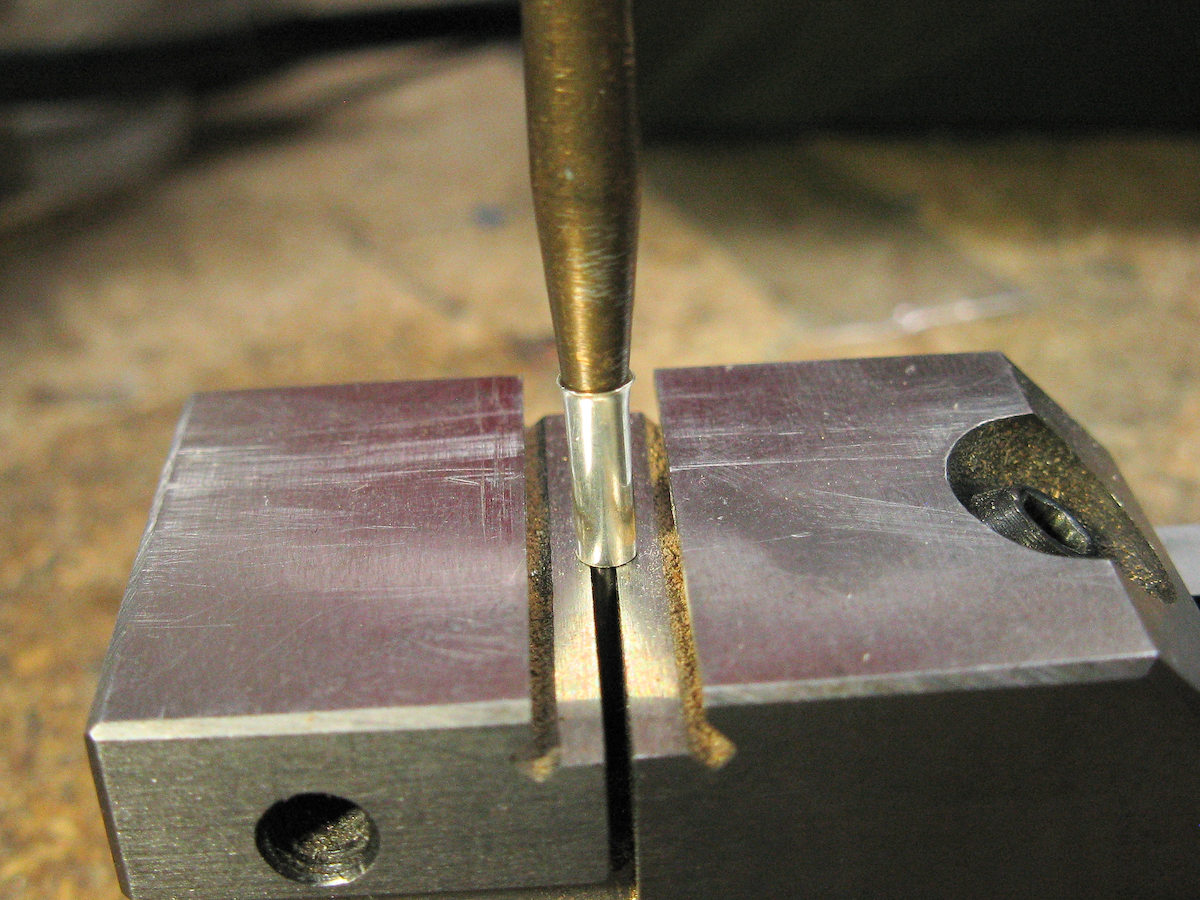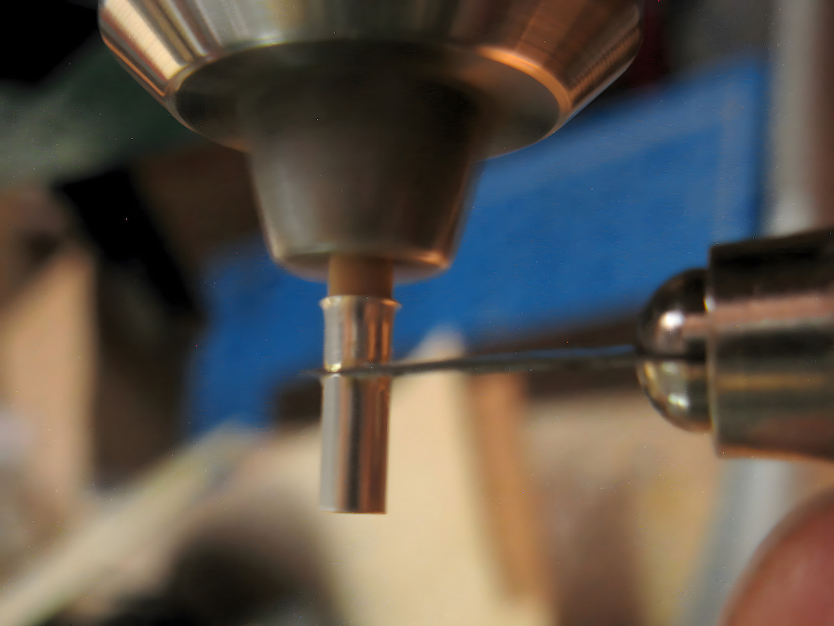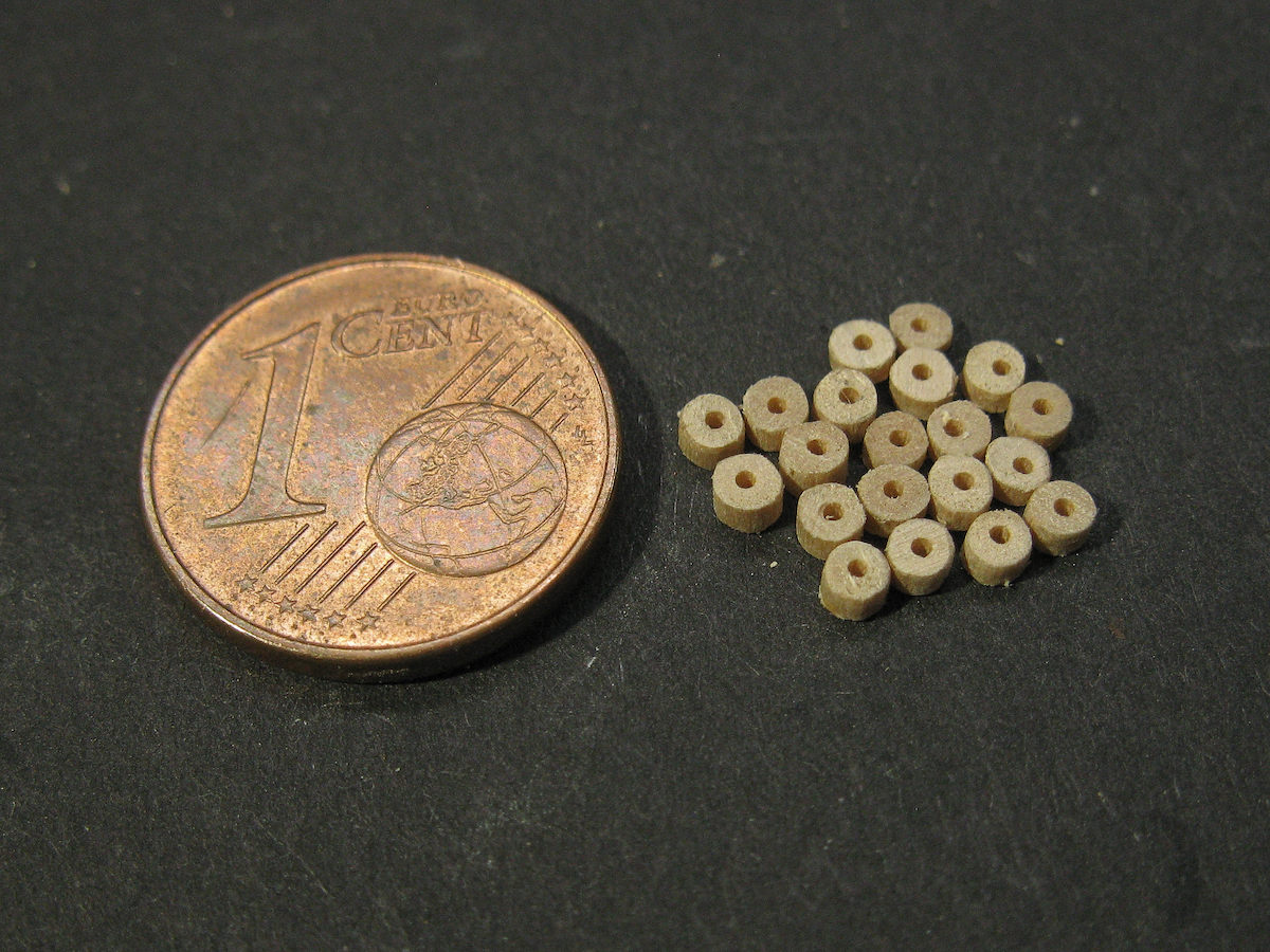 Dann die Hülsen stramm auf ein Rundholz gesteckt und mit einem Skalpell an der Bohrmaschine abgestochen.