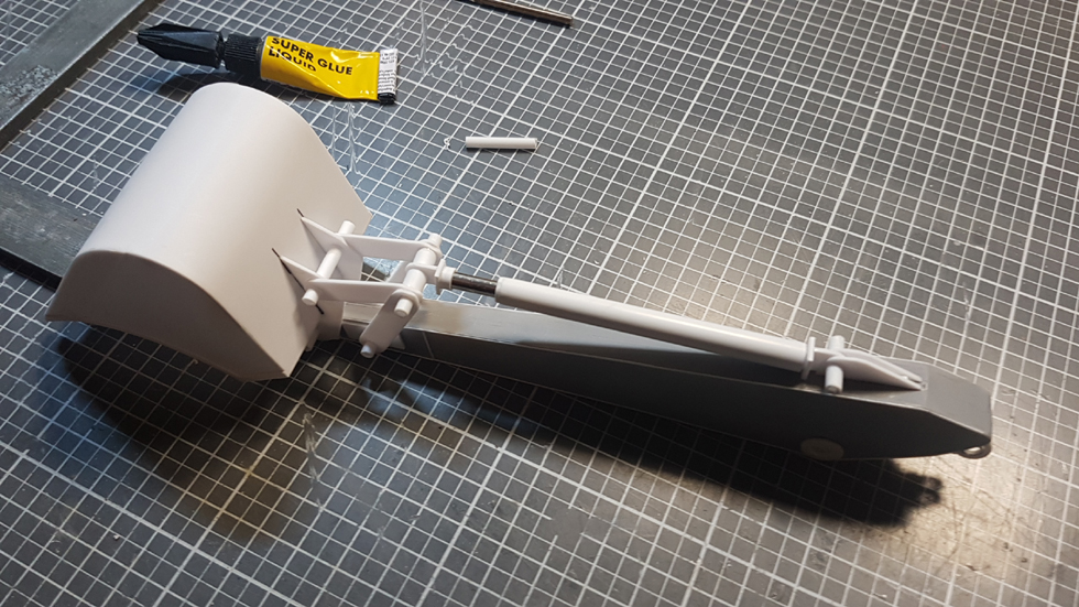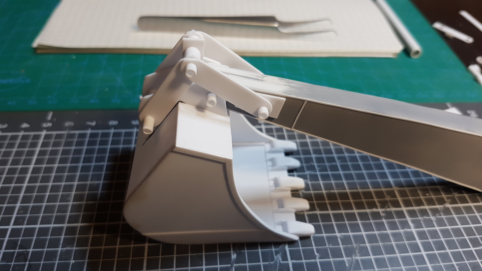 So sehe ich das auch. Die beiden Polyrohre an der Schaufel, an denen bis jetzt die Kippmechanik ansetzt wird einfach durch ein festes (oben) ersetzt und unten kommt eine angedeutete Hydraulik-Verriegelung. Diese muss ja nicht beweglich / funktionsfähig seinDazu brauchst du nur den Arm vorne etwas ummodeln. Ist aber nicht viel Arbeit.