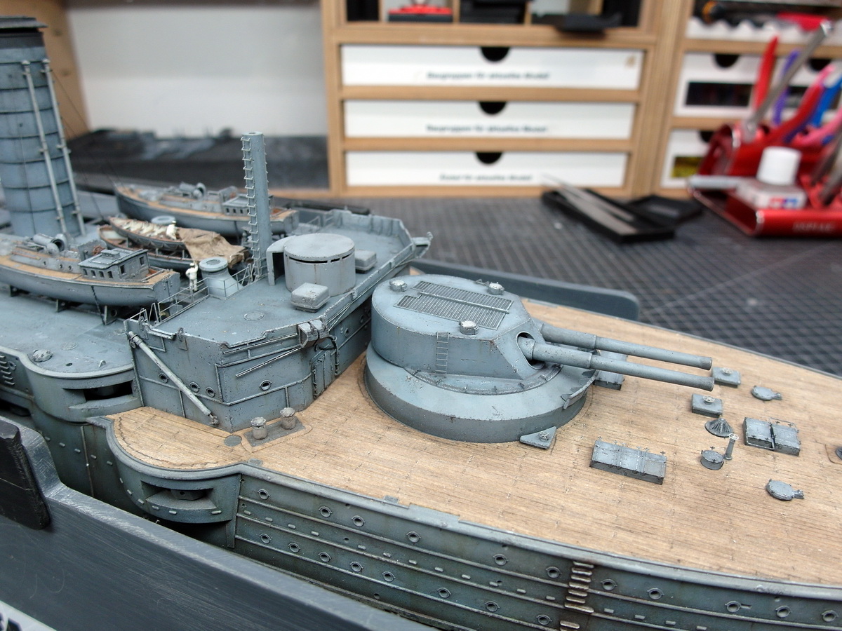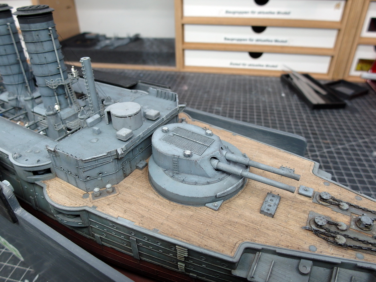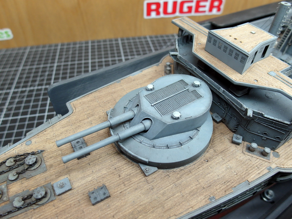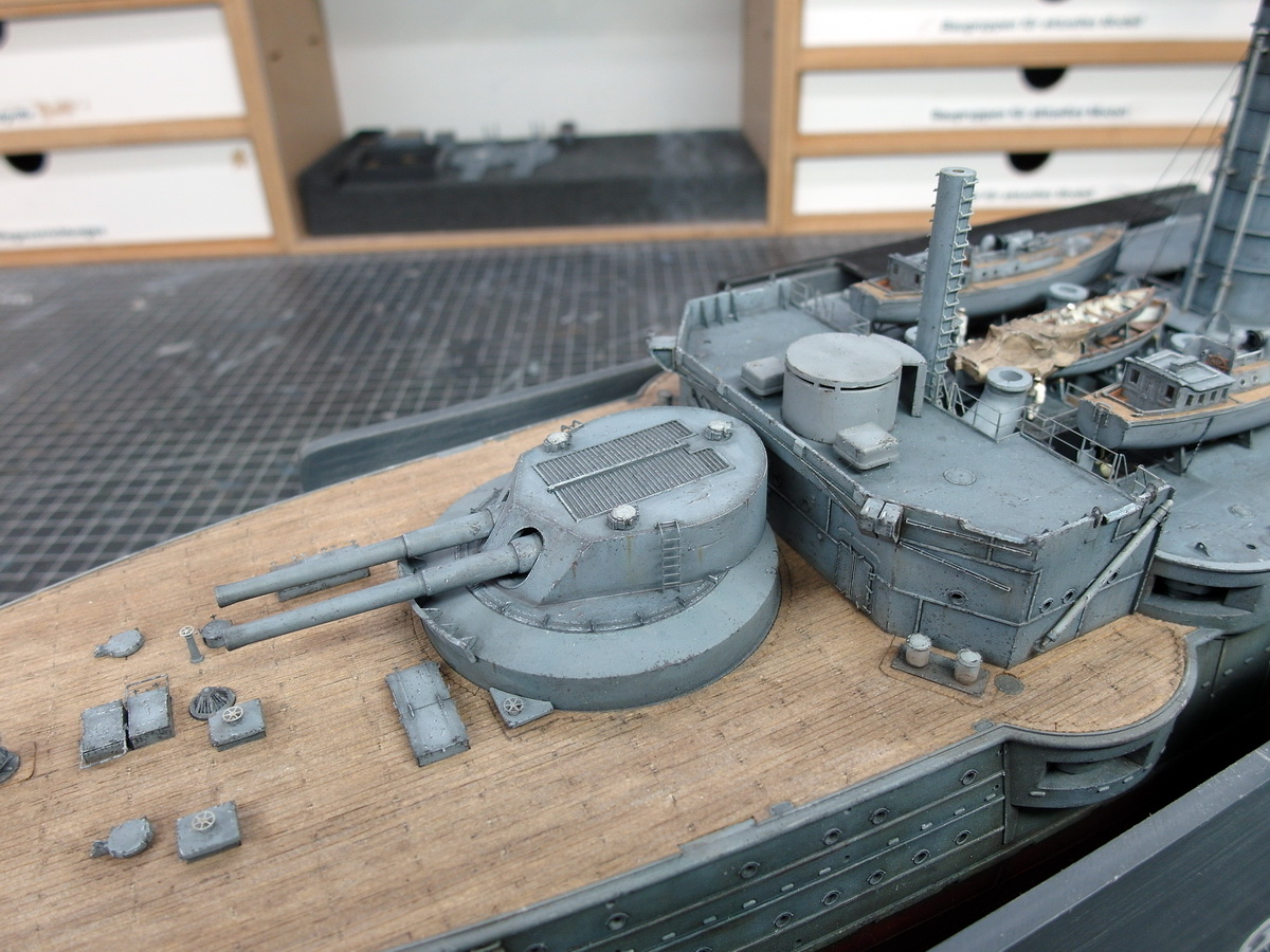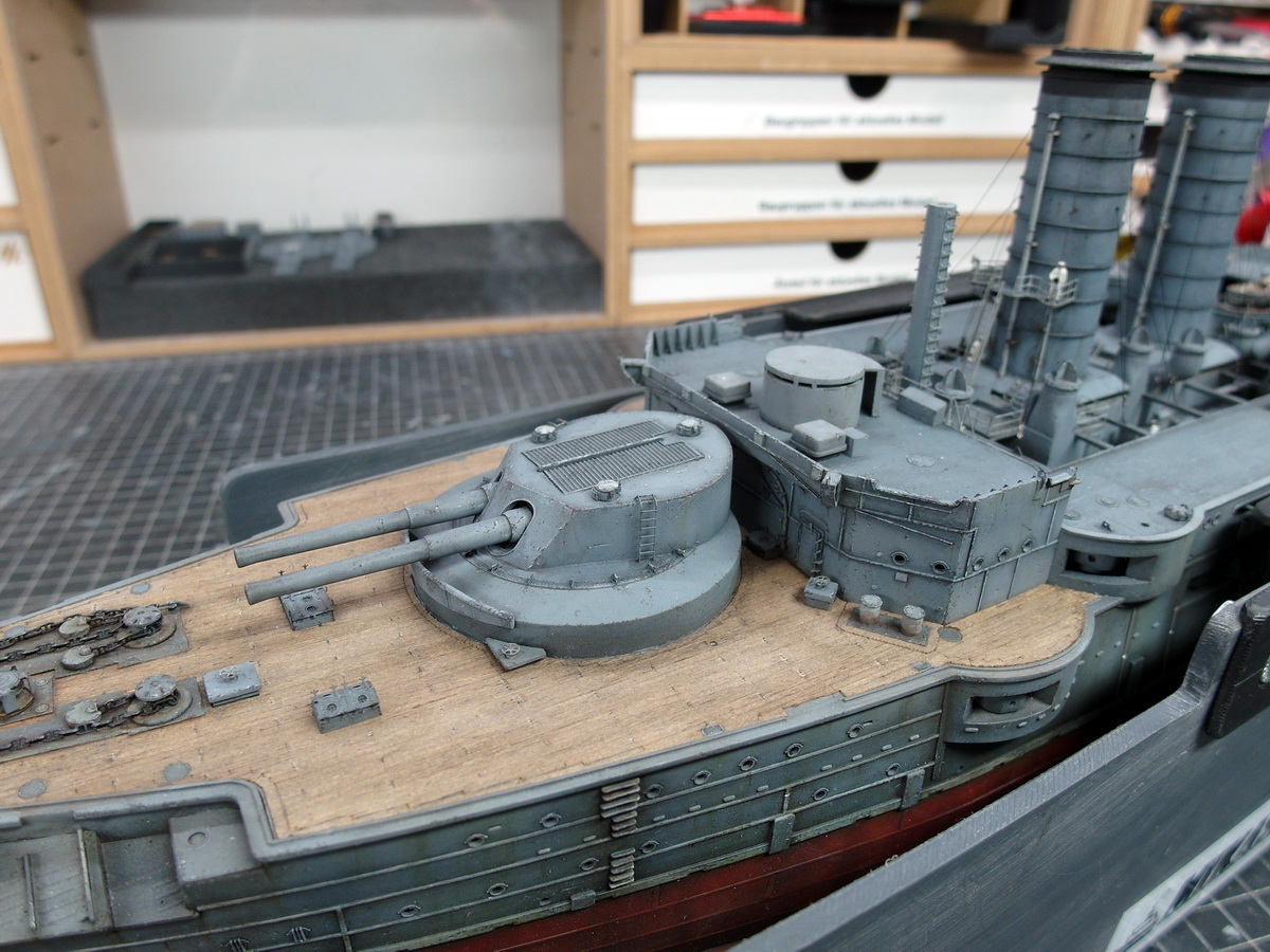 Beim einlegen der Türme in ihre Barbetten viel mein Augenmerk noch mal auf die Brückenhäuser mit den von mir abgewandelten Strukturen aus Styrenprofilen.