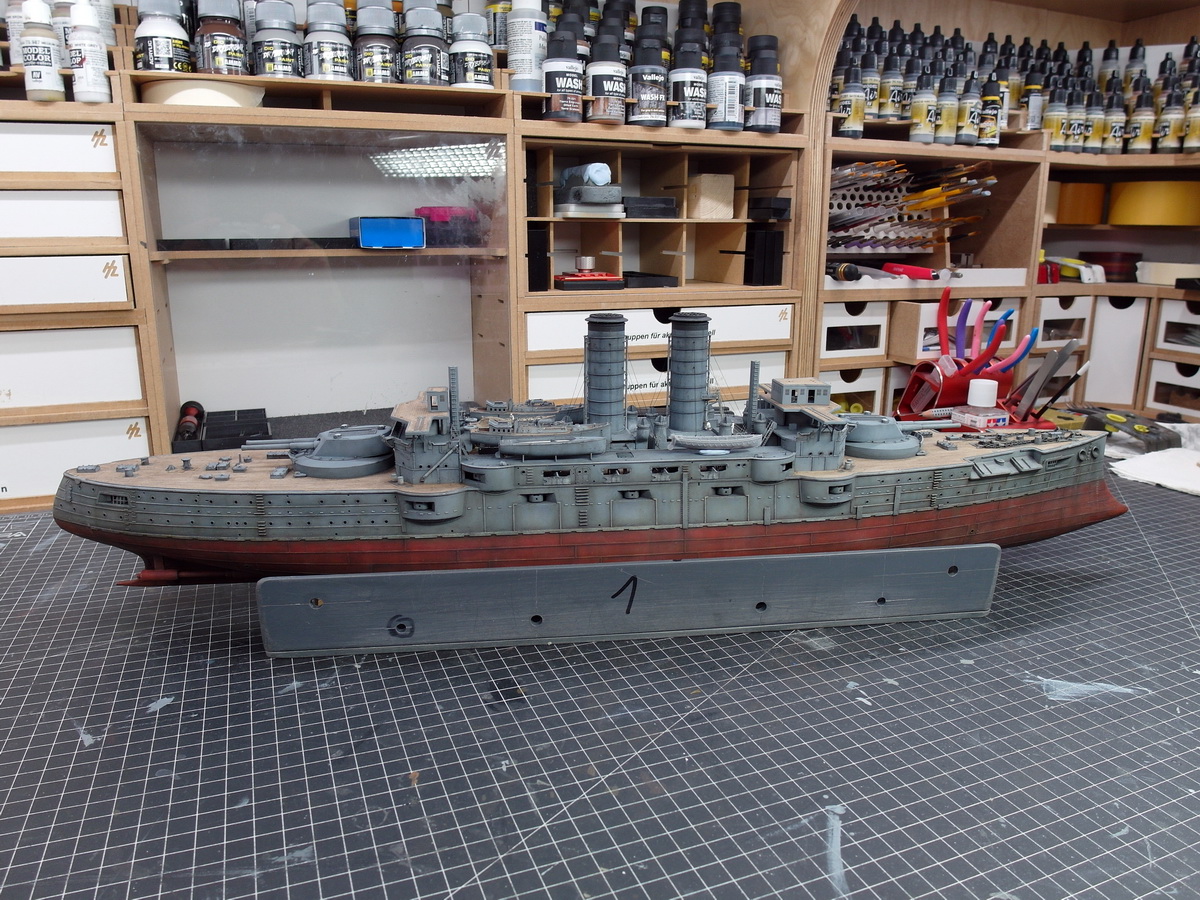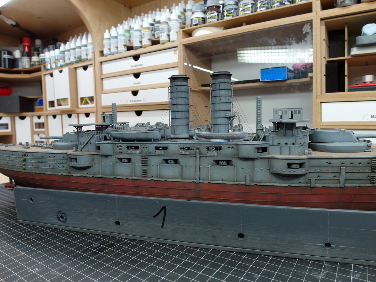Solche kleinen Macken an Grundierung und/oder Lack sind wirklich keine Tragödie, jedenfalls nicht bei einem Kriegsschiff, das dann auch noch gealtert wird. Bei einem Automodell ist das was anderes, da ist so ein Kratzer so unauffällig wie die Tarantel auf der Sahnetorte und mindestens genauso ärgerlich wie beim Original.