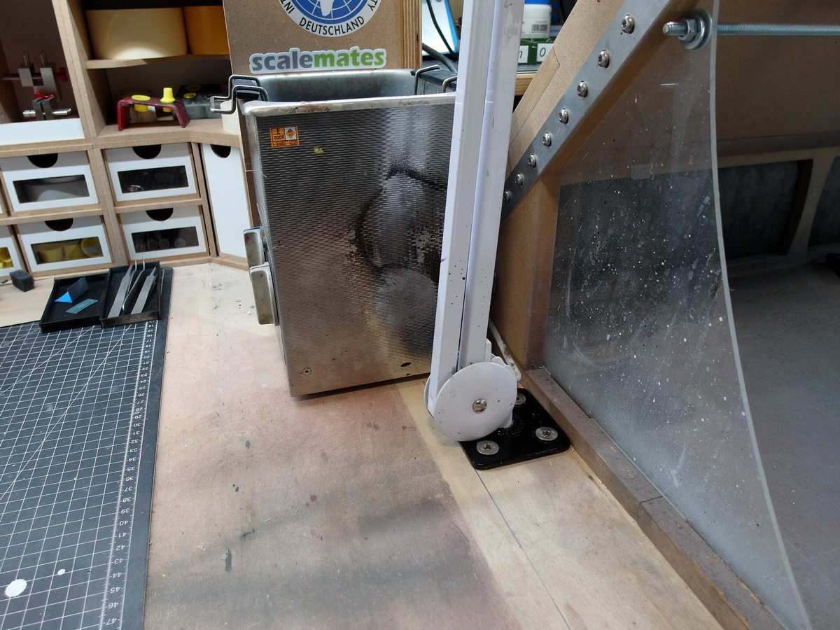 Und darum habe ich mir eine wenig mehr davon besorgt. Mein Problem waren die beiden Arbeitsleuchten, welche am Tischrand recht eng zusammenstanden. Bei der Mikasa kein Problem, aber mit einem über 1300 mm langen Rumpf habe ich Angst dagegen zu stoßen, wenn ich diesen zum Beispiel drehe.