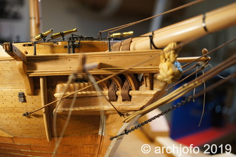 Die Sorgleinen, aus gekleideten Tauen mit eingebundenen Kauschen und Führungsaugbolzen zu den Ketten hin wurden ergänzt.