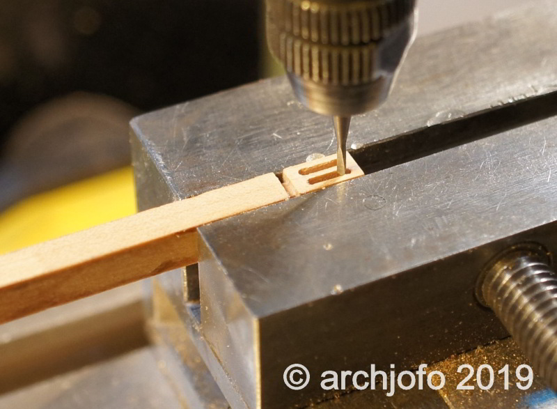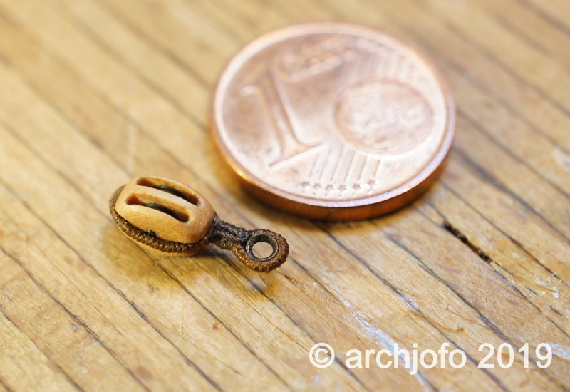 Bevor ich in die Serienfertigung der Blöcke beginnen kann, versuchte ich für die Herstellung der größeren Blöcke an Hand der Blöcke für die Großbrassen, die am Heckausleger befestigt waren, meine bisherige Methode zu verfeinern. Im Ergebnis wird es wohl zum Großteil Handarbeit bleiben.