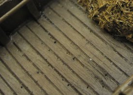 Laut den mir vorliegenden Konvertierungstabellen soll es Humbrol 62 entsprechend, dem „Lederbraun“, das ich unter anderem bei einen der (hier noch nicht vorgestellten) Huker verwendet habe, um ein stärker mitgenommenes und dunkleres Holz darzustellen. Nach meiner Erinnerung ähnelt der besagte Revell Farbton allerdings mehr meinem Standard Holzbraun Humbrol 63. Heikler aber ist der Umstand, dass besagte Revell Farbe seidenmatt auftrocknet, was im physikalischen Sinne nichts anderes bedeutet, als dass ihre Oberfläche glatter ist. Glatte Oberflächen aber nehmen die Ölfarbe weniger stark auf und führen dazu, dass sie beim Wegwischen nicht die feine „Holzmaserung“ der Schleifung abbildet, sondern bloß zu einem ekligen Geschmier führt, woraufhin die Bordwand womöglich aussieht, als habe man ein Badezimmer nach einer unaussprechlichen Magen-Darm Katastrophe nur oberflächlich gereinigt.