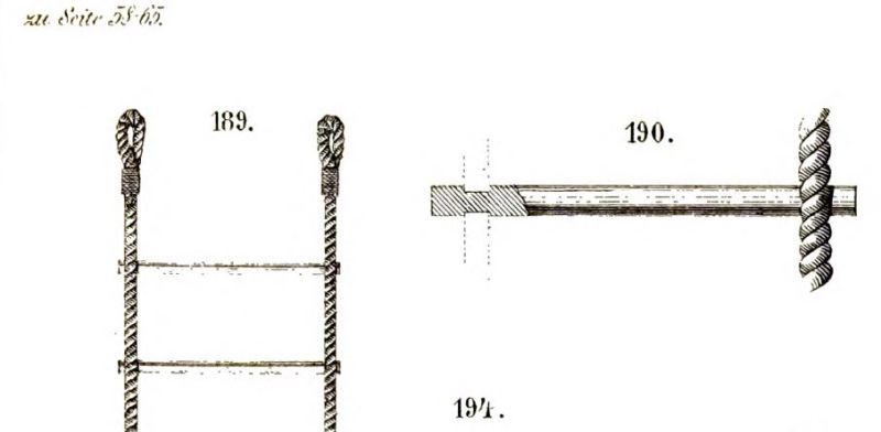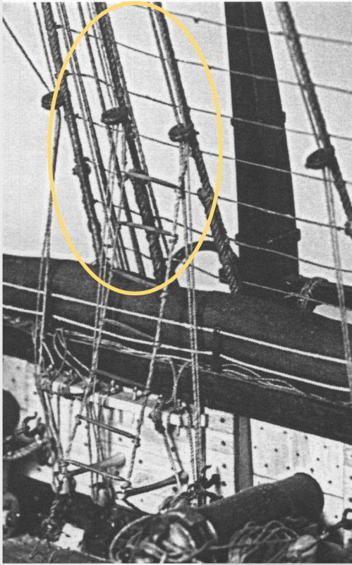 Es spricht vielmehr dafür, dass die Sprossen wie auf dem folgenden Bild durch die Kardeele des Taues gesteckt und mit Bändselungen gesichert waren.