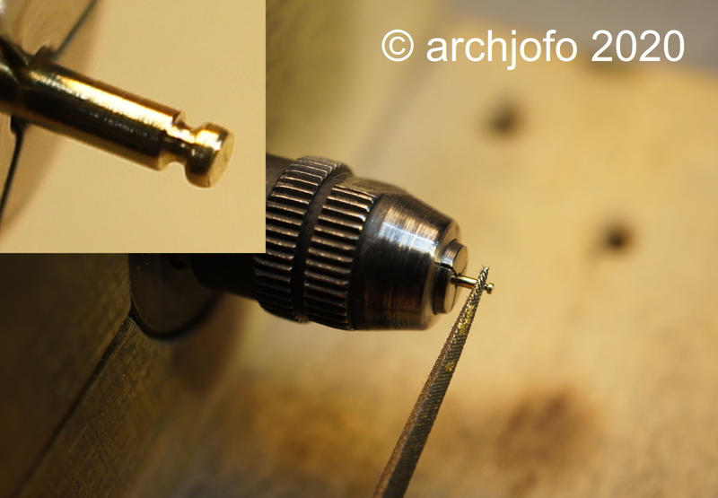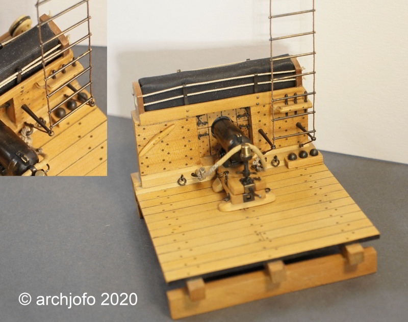 Die Trägertaue werden mittels kleiner Augbolzen oben auf dem Wassergang befestigt. Die konischen Abstandsträger habe ich bereits vor längerer Zeit aus Messing gedreht und brüniert.