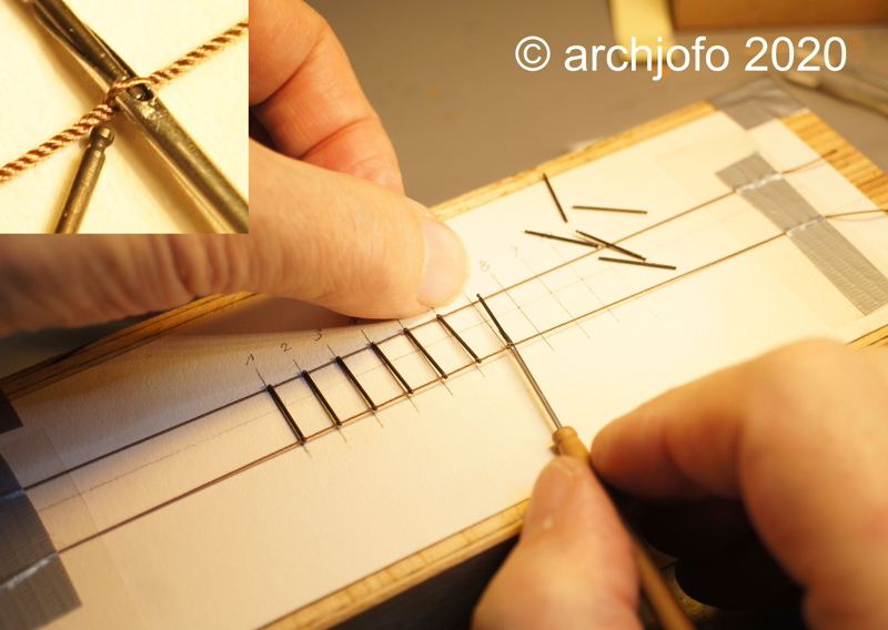 Zum Durchstecken der Sprossen bediente ich mich einer Fertigungsvorlage. Dementsprechend zeichnete ich auf einen Karton die Sprossenabstände mit 7,2 mm und die Spossenweite der Jakobsleiter auf. Anschließend wurden die Trägertaue aufgespannt und mit einem Hilfswerkzeug (Hohlspieker) die Sprossenköpfe durch die Kardeele gesteckt. Mit etwas Übung geht es dann letztlich sehr flott von der Hand.