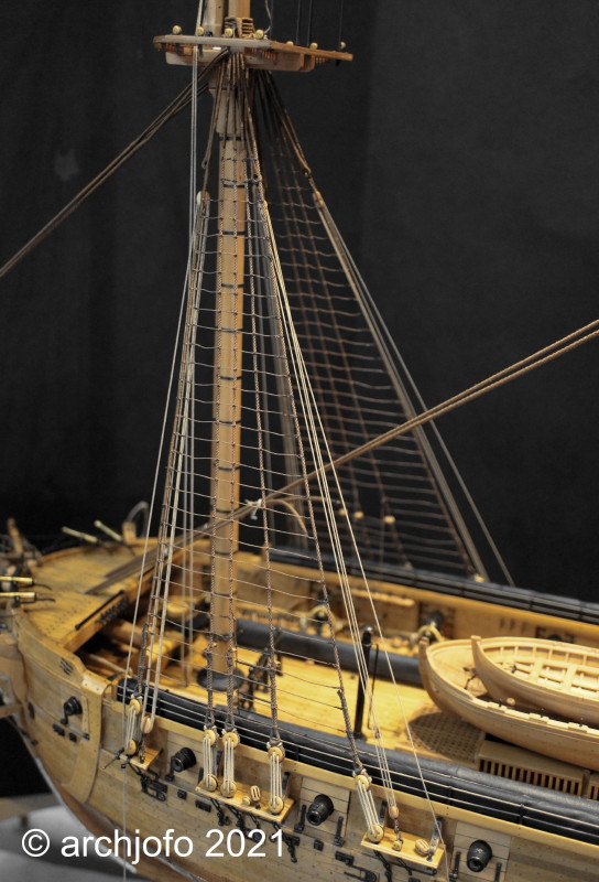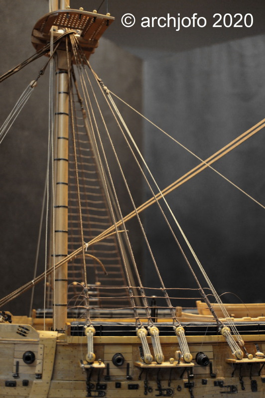 Darüber befinden sich an den Wanten aller Masten und zum Teil auch an den Backstagen oder Pardunen sogenannte Leitkauschen mit einer, zwei oder drei Bohrungen. sie werden zur Führung der Taue des laufenden Guts verwendet, also auch vorbildlich.
