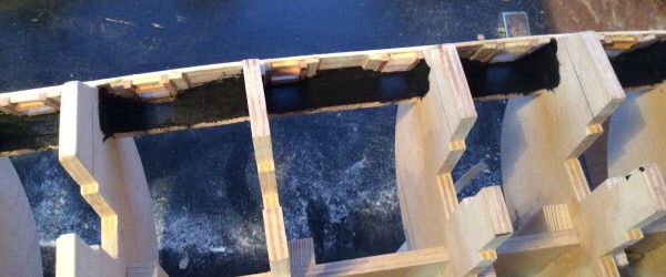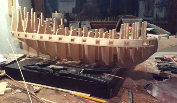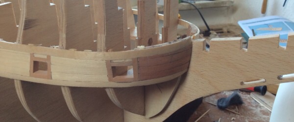 das ich den vordersten Bereich nicht mit Balsaholz gefüllt habe sondern innen hohl gelassen habe und Streben setzte, diese auch gleich aus Birnbaum. Vereinfacht später die Einführung des Ankertaues.