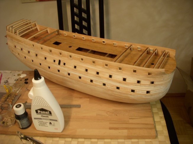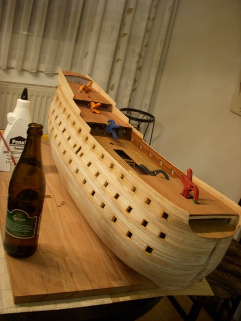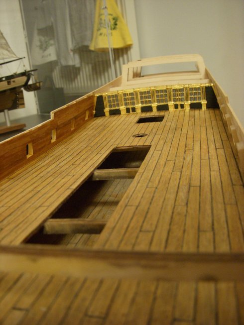 . Vor allem gefallen mir die Pfortendeckel mit den Scharnierbändern. Daher wird meine Anmerkung auch später nicht mehr ins Gewicht fallen: Es stimmt wohl, Türen an Schotts waren offensichtlich immer deutlich kleiner gewesen, als man sich das gemeinhin von Türen so vorstellt (so zumindest hatte ich das auch auf einigen Repliken so gesehen und mich gewundert, auf der Amsterdam, dem Nachbau eines Ostindienfahrers im Amsterdamer Schiffahrtsmuseum hatte ich mir beim Gelangen ins Gallionsdeck ziemlich heftig deshalb den Kopp gestossen...), aber ich hätte sie eventuell nach oben hin etwas höher ausgearbeitet und im Bereich des Bodens stattdessen eine leicht erhöhte Schwelle als unteren Türrahmenabschluss eingearbeitet: Bei überkommender See auf dem Gallionsdeck -was wohl häufig vorkam- steht ansonsten die innere Back gleich mit unter Wasser, da das ablaufende Wasser sofort eindringen, und nicht seitlich ablaufen könnte. Aber lass das so, das sind Details, die man später sowieso wohl nicht sieht. Andererseits wäre für eine kleine Schwelle im Übergang zwischen Gallionsdeck und Backinnenraum sogar eventell noch Platz, so wie es auf den Bildern aussieht, wo das Licht von hinten durchfällt. Nur als Tipp zum Draufrumdenken...