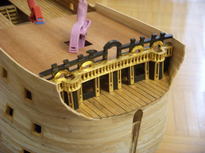 , danach wurden die erhabenen Stellen mit Goldfarbe angestrichen und danach Blattvergoldet, die Zwischenräume zwischen den Säulen sind doch so eng das ich da keine Figur mehr rein bekomme (glaube ich), ich werd aber nochmal im Netz suchen, vielleicht finde ich doch noch was Schlankes was ich da reinpfrimeln könnte. Heute Abend möchte ich dann die Stückpforten und Türen an dem Schott machen....ach ja und die Bögen an der echten Reling vorne wurden auch noch vergoldet....